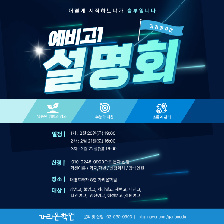 어떻게 시작하느냐가 승부입니다. 고등 국어는 중등 국어와는 판이하게 다릅니다. 문제 양도 많고, 지문은 훨씬 어렵고 길고, 평가 기준도 완전히 달라져요. 게다가 2022 개정 교육과정이 적용되면서 내신과 모의고사를 동시에 대비해야 하는 구조가 되다 보니, 무작정 시작하면 금방 지치기 마련이죠. > 고등 국어, 왜 어렵게 느껴지는지 > 2022 개정 교육과정의 핵심 변화 > 내신과 모의고사, 어떻게 병행할지 > 학교별 출제 경향, 어떻게 반영되는지 > 가리온학원의 학습 시스템 & 운영 방식 실제 사례와 함께 구체적으로 말씀드릴 예정이에요. 자주 받는 질문들이에요 Q. 아직 학원 정할 생각이 없는데 설명회만 들어도 되....... <img src="https://blogthumb.pstatic.net/MjAyNjAyMTJfNyAg/MDAxNzcwODk0NzQ2NTQ3.lyJC5LPpnARXiSgR2AD__5sRL42OM2WGEw-3v5HuPf0g.tYuenxQFY1KLmhH_Fbr8pr3qbxuwJSkF244nBcvRukgg.PNG/%C1%A6%B8%F1%C0%BB_%C0%D4%B7%C2%C7%D8%C1%D6%BC%BC%BF%E4._%2811%29.png?type=s3" />