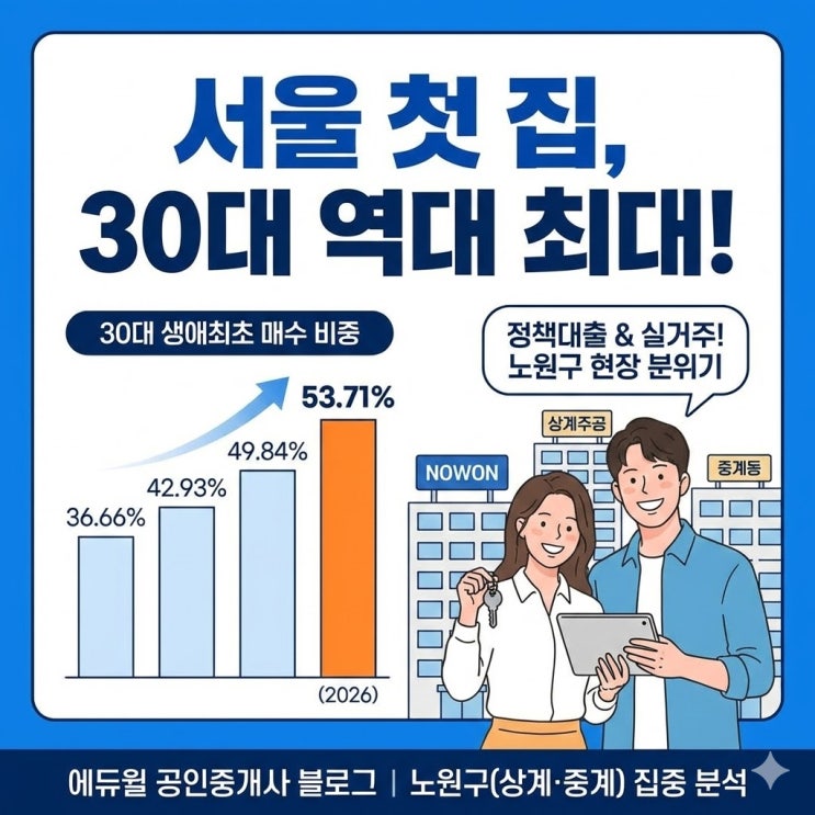 안녕하세요! 에듀윌 공인중개사입니다. 최근 부동산 시장의 주인공은 단연 '30대'입니다. 오늘 발표된 통계에 따르면 서울에서 생애 첫 집을 마련한 이들 중 30대 비중이 약 50%에 육박하며 역대 최고치를 기록했는데요. 강력한 대출 규제 속에서도 30대들이 왜 서울, 특히 노원구로 몰리고 있는지 현장의 생생한 분위기와 함께 짚어보겠습니다. 1. 통계로 본 30대 '쏠림' 현상 지난해 서울 집합건물 생애최초 매수자 중 30대는 3만 482건(49.84%)으로, 2010년 통계 공개 이후 가장 높은 수치를 보였습니다. 올해 1월에는 이 비중이 53.71%까지 올라가며 30대의 '내 집 마련' 의지가 얼마나 강한지 보여주고 있습....... <img src="https://blogthumb.pstatic.net/MjAyNjAyMTlfOTkg/MDAxNzcxNDY1MDA1Mjkz.U_XUZzJSDzAR4vb1VuLgRZOTcWG2_D1dftLkigLnBGsg.wfLcTaHJ_eu2GBNVLunA8eGEvH4IdZNnY_Rf7AlXIaIg.JPEG/unnamed_%2858%29.jpg?type=s3" />