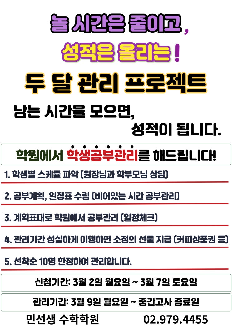 남는 시간을 모으면, 성적이 됩니다. 안녕하세요. #은행사거리수학학원 민선생 수학학원입니다. 4월 말이면 어느덧 중간고사가 시작됩니다. 시험은 아직 멀어 보이지만, 성적은 지금부터 만들어집니다. "집에서는 잘 안해요..." 학부모님들과 상담을 하다 보면 이런 말씀을 자주 듣습니다. “학원 다녀오면 그냥 쉬어요.” “시간은 많은데 공부는 안 해요.” “마음은 있는데 관리가 안 돼요.” 아이들이 공부를 안 하려는 것이 아닙니다. 시간을 스스로 관리하는 힘이 아직 부족한 것입니다. 그래서 이번 3월과 4월, 저희 학원에서 아이들의 시간을 조금 더 단단히 잡아보려 합니다. 3·4월 중간고사 관리 프로그램 운영 학교와 학원....... <img src="https://blogthumb.pstatic.net/MjAyNjAyMjhfMTY0/MDAxNzcyMjYxMzA1NTIx.EtxWeOGjHloSTJGFrYppq3J-hGoyALdefGq1vOtqZe4g.QiqlhSLsHuIJjyo53LECaGvMoZSEASUBIPGbpOz4lEkg.JPEG/%B5%CE%B4%DE%B0%FC%B8%AE.jpg?type=s3" />