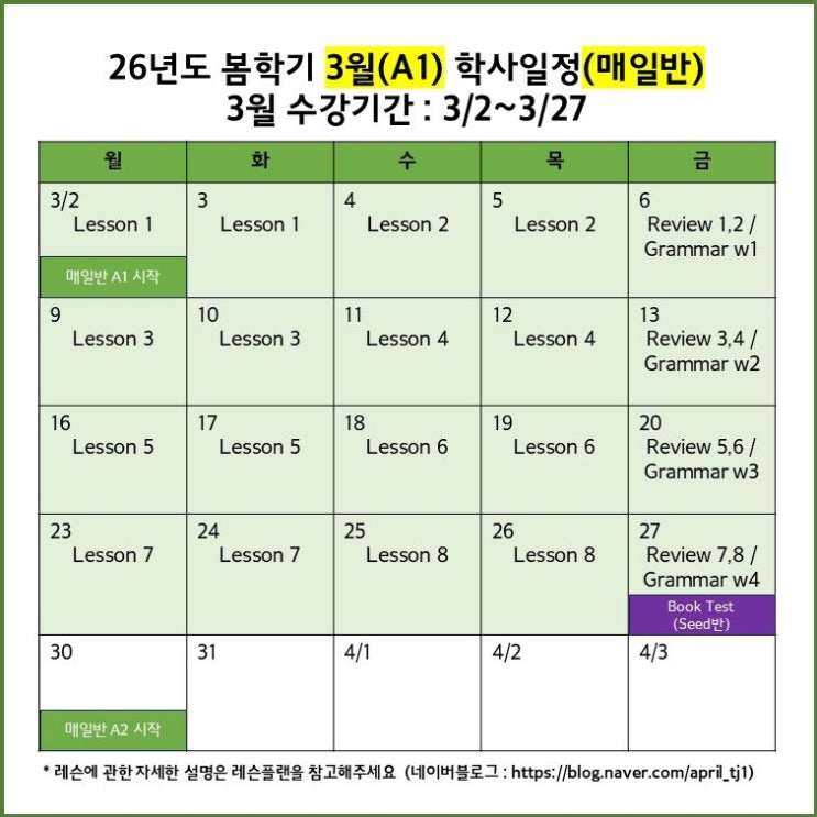 [3/2 정상수업] 에이프릴어학원 26년 봄학기(A1) 학사일정 안내