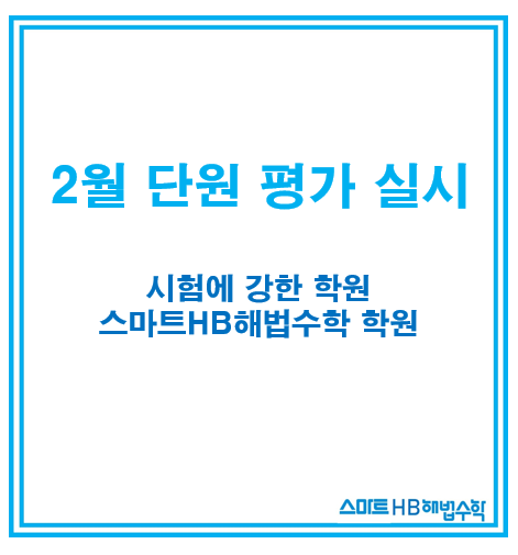 안녕하세요. 천보초, 율정초, 율정중, 옥정중, 옥정 대방 디에트르 2차 수학을 책임지는 스마트 HB 해법수학 학원입니다. 저희 학원에서는 매달 마지막 주에 단원평가를 실시합니다. 이름하여 단원평가 WEEK~! 지난 2월에는 전체 학년 1학기 2단원 시험을 보았습니다. 총 11회차의 시험을 보며 단계가 올라갈수록 시험의 난이도는 올라갑니다. 마지막 11단계에서는 서술형 평가까지 치르게 됩니다. 90점 미만은 재시험 90점 이상은 다음 단계로 넘어가게 되죠. 기본 개념 문제부터 개념을 응용한 여러 유형 문제들, 단계가 올라갈수록 최상위 문제들도 접하게 되는데요. 고민하며 문제들을 풀어가고 그 속에서 인내와 성취감을 느끼게 됩니다. 드....... <img src="https://blogthumb.pstatic.net/MjAyNjAzMDZfMzcg/MDAxNzcyNzU4Njg0MzUy.y3DoGuYGbD1afUwRExLs_TcDM8GZSG6flTBEnmRTx6Mg.o1Xdmdqku3GEjnqxkDIsSEel3lyt-vpOWeQsdLJPccQg.PNG/%BD%BA%C5%A9%B8%B0%BC%A6_2026-03-06_095739.png?type=s3" />