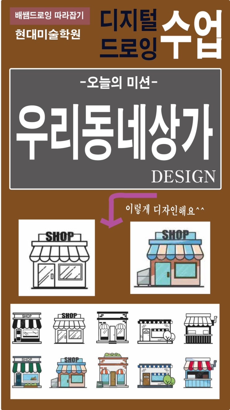 안녕하세요 현대미술학원에서 그림을 배우고 있는 미술이입니다! 미술이가 소개하는 오늘의 디지털 드로잉 미션 우리 동네 상가 디자인 ✏️ 오늘 배쌤 선생님이 준비한 미션은 바로 “우리 동네 상가 디자인하기” 입니다. 요즘은 그림도 디지털 드로잉으로 많이 그리는데요. 아이패드나 태블릿을 이용하면 스케치 → 채색 → 디자인까지 한 번에 할 수 있어서 정말 재미있어요! 오늘 미션은 간단하지만 디자인 감각을 키우는 아주 중요한 연습입니다. ⸻ 오늘의 미션 우리 동네 상가를 디자인해요 먼저 기본적인 상점 모양을 스케치합니다. ✔ 지붕 ✔ 간판 ✔ 창문 ✔ 출입문 ✔ 차양막 이렇게 기본 구조를 그린 후 색과 디자....... <img src="https://blogthumb.pstatic.net/MjAyNjAzMTJfOTcg/MDAxNzczMzE4MjkyMTQ5.BlQHIrY_xN7kVcDYdCPNu1igKA2Os3QfUTOlKynPIKsg.8Ytm78UyRwA6FqWBSMxS6zKG-0O1KaY_2mGibi_28Zgg.JPEG/IMG%A3%DF5019.JPG?type=s3" />
