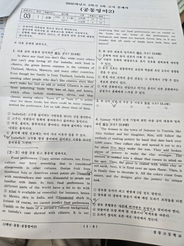 지금은 강릉이 평준화라서 학군이라는 것이 없지만, 평준화 속에서도 학교별 내신 전략이라는 것이 있는 듯 보인다. 어느 학교는 시험이 쉽고 잘하는 아이들이 많이 몰리지 않아서 내신 따기가 더 쉽다는 얘기 등이다. 승*는 아버지의 모교라서 '강릉고등학교'를 선택하기도 했겠지만, 일단 강고가 내신에서 더 유리하다는 판단을 한 것 같다. 현재 일반고에서 성적을 잘 유지하는 편으로 고등학교1학년 내신관리에서는 나름 선방했다고 본다. 특히 이번 기말고사는 성적이 매우 잘 나온 것으로 아는데, 영어는 선생님들이 서술형에서 점수를 매우 후하게 주셔서 100점을 맞아왔다~~^^ 기말고사 점수는? 100점! 강릉고 서술형은 모두 &....... <img src="https://blogthumb.pstatic.net/MjAyNTEyMzFfMzAw/MDAxNzY3MTczNDQ1MTA3.ojtr-nbrsQbLWkHK_rb_nyI3nj1_y4Yh8-CGyBydrwgg.mdV3QijLdQLbpcDU0JlIGHnSO-QV5vN9ArfyRbm5ooUg.JPEG/20252%C7%D0%B1%E2%B1%E2%B8%BB%BD%C3%C7%E8%C1%F61.jpg?type=s3" />