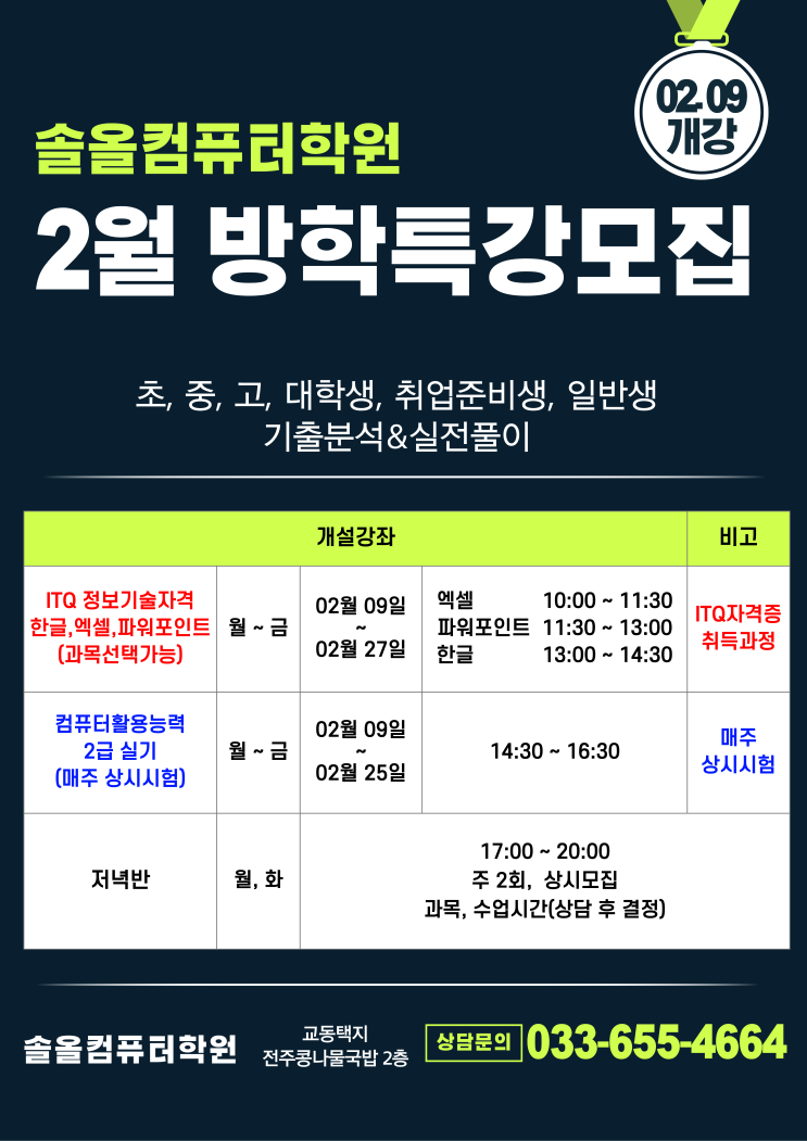 2026년 2월 겨울방학특강 2차 모집합니다. 2월 ITQ정보기술자격증 !!! 수강과정당 정원 12명 선착순 마감 !!! 학원 수업 관련 문의는 전화상담 / 방문상담해 주시면 빠르게 상담 도와드리겠습니다. :) " 방문상담시 상담예약전화 부탁드립니다." 수업중에는 전화통화가 힘드실수 있습니다. 기다려주시면 연락드리겠습니다. * 교동택지 구름다리옆 전주콩나물국밥 건물 2층* * 상담문의 033-655-4664 * <img src="https://blogthumb.pstatic.net/MjAyNjAxMTVfMjkw/MDAxNzY4NDYxMzY4NzM5.OLOmJxVcSkTib3FfqzUxqpZTYD9xcRWYU_APs2VpsdYg.jql_IKQqUq04M105h7A4l6asAjTlsU7fkQ9vA7G4rt0g.PNG/%C1%A6%B8%F1%C0%BB_%C0%D4%B7%C2%C7%D8%C1%D6%BC%BC%BF%E4..png?type=s3" />
