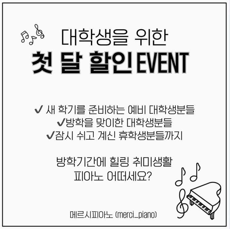 새로운 취미를 찾고 계신 예비대학생 / 대학생 / 휴학생들을 위한 첫달 원비 할인 이벤트를 시작합니다! 방학기간 동안 피아노로 힐링하세요~ <img src="https://blogthumb.pstatic.net/MjAyNTEyMjBfOTIg/MDAxNzY2MjE3Nzc2NDk1.xr7_clug3KX2oOSddQvHEaNqZV3YMRazdPoT-0Zad9Ig.DTMysHAjbGflWegecWgJ-G_ZcO7LsWfUaObro9X4OsUg.JPEG/IMG%A3%DF2766.jpg?type=s3" />
