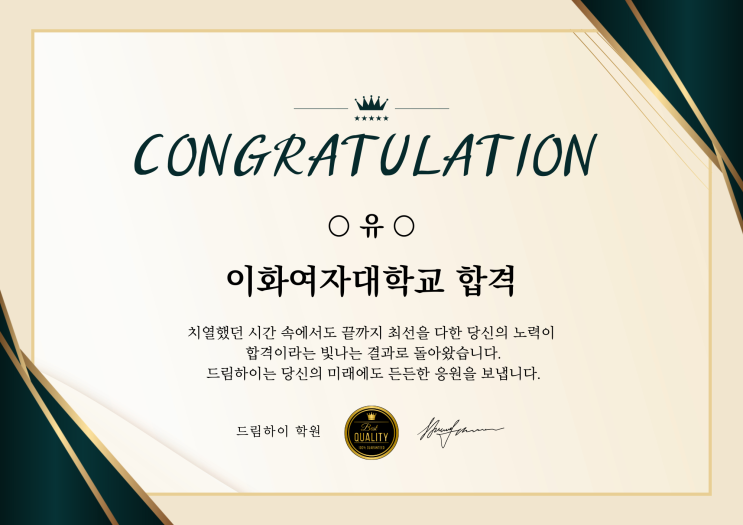 드림하이 학원 2026학년도 대입 이화여자대학교 합격 축하합니다!♥ 힘든 고3 시기를 잘 버텨낸 유○ 학생!! "수시 골라가자!!!" 라고 했던 말이 사실이 되다니 너무 기특하고 축하합니다!! 이렇게 드림하이에서 2명의 이대생이 나왔군요!! 집도 가깝고 예쁜 학교에 입학하게 되었네요 ^^ 좋은 소식 들려주어 고마워요 ♥ ♥ ♥ <img src="https://blogthumb.pstatic.net/MjAyNTEyMjNfMjM2/MDAxNzY2NDY4MDQ3NDg0.NfU8tne_yk-LKNMfMOzkBoc6mg3sJ1vpv1WbWE4OOvUg.m4Kn1g4VcOZOdEFRjFEzu7bMNKBNbhFUw4yRa0CdpnUg.PNG/%BD%C9%C0%AF%C1%F8_%C7%D5%B0%DD%C0%E5_%282%29.png?type=s3" />