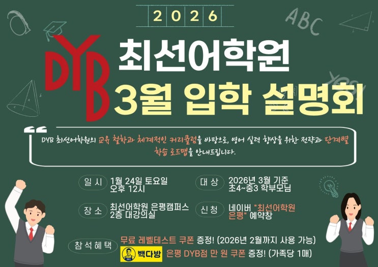 안녕하세요~ DYB 최선어학원 은평캠퍼스입니다! 작년 11월에 진행되었던 2026년 입학설명회 이후로 정말 많은 학부모님들께서 문의를 주셨습니다! 그 감사한 성원에 힘입어, 새로운 학기를 맞이하며 2026년 DYB 최선어학원 3월 입학 설명회를 준비하게 되었습니다! <설명회 일정> 1월 24일 토요일 오후 12시 <장소> 최선어학원 은평캠퍼스 2층 대강의실 <설명회 주요 내용> ● 바뀌는 교육 정책, 내 아이 대비 전략 ㅡ 개정 교육과정과 입시 변화 속에서 놓치지 말아야 할 핵심 포인트와 준비 방법을 함께 살펴봅니다! ● 아이 맞춤 학습으로 쌓는 탄탄한 영어 실력 ㅡ 학년과 수준에 따라 설계된 체계적인 커리큘럼으로 기초....... <img src="https://blogthumb.pstatic.net/MjAyNjAxMjFfNzMg/MDAxNzY4OTkxMjU5ODUy.JEnMwxAfVzusPtbOWYqyrTJ5ww29TttyeSfKNmwQ1CIg.p0QZ5gYDpMQuFSKJCQVazkTfzh5ey41KwmG2l4aPZV4g.JPEG/2026_%BC%B3%B8%ED%C8%B8.jpg?type=s3" />