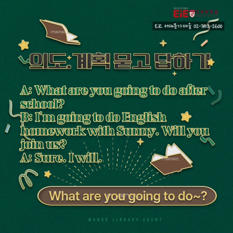 안녕하세요~! EiE 고려대 국제어학원 서대문 가재울 캠퍼스입니다. 오늘은 상대방의 의도나 계획을 묻는 표현을 학습해보아요! 상대방의 의도나 계획을 물을 때는, "What are you going to do?" (당신은 무엇을 할 예정입니까?) "Will you + 동사원형...?" "Are you planning to + 동사원형...?" 등의 표현을 씁니다. 자신의 계획을 말할 때는, "I'm going to + 동사원형..." 또는 "I will + 동사원형..." 이라고 말할 수 있어요~. Expression Plus! Sunny: Are you going to go to the party? (너는 그 파티에 갈 거니?) Sherlock: Yes, I am. (응, 그럴 거야) / No, I'm not. (아....... <img src="https://blogthumb.pstatic.net/MjAyNjAxMjJfMTMz/MDAxNzY5MDcwMjQ4NzU5.XF4BpAgLK9F6a7dnijW1mw5lsixbXd0BVQa9SPbVWPog.eBcveyP0rcXEH7fwg_SW40c_E_j9hsDUvvTCWAGm5Egg.PNG/Jan-1.png?type=s3" />