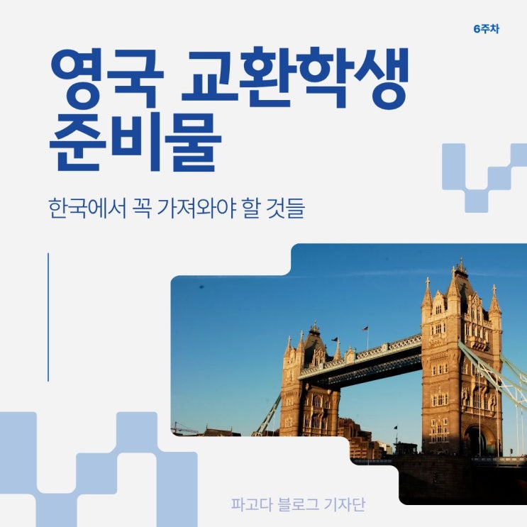 안녕하세요, 파고다 블로그 기자단 최유진입니다. 저는 지난주 영국에 입국하였는데요, 영국에서 생활하며 실제로 필요하다고 느낀 준비물을 정리해 보려고 합니다. 이번 글에서는 1탄으로 한국에서 꼭 챙겨와야 할 것들을 소개해 볼게요! 서류 및 카드 영국에 입국 시 입국 목적과 거주지를 물어보는 경우가 있기 때문에, 입학허가서와 기숙사 계약서를 미리 준비해 두는 것이 좋습니다. 또한 영문 보험증서도 1부 정도 출력해 두면, 혹시 모를 상황에 도움이 될 수 있어요. 저는 3가지를 출력하여 L자 파일에 넣어 들고 왔습니다. 국제학생증(ISIC)과 함께 해외에서 결제가 가능한 트래블로그, 트래블월렛 등의 카드도 꼭 챙기는 것을 추천드립....... <img src="https://blogthumb.pstatic.net/MjAyNjAxMjZfMTcy/MDAxNzY5Mzg1NjI5NzAz.r_PPhDX_uwo-Yt-YnHbbBL6xzdR0tx0rX1NZPoffthog.BLl4OUaB-A99XOX2xHaBfZkHzueP2-z8RemnwqJIQcAg.JPEG/1_%284%29.jpg?type=s3" />