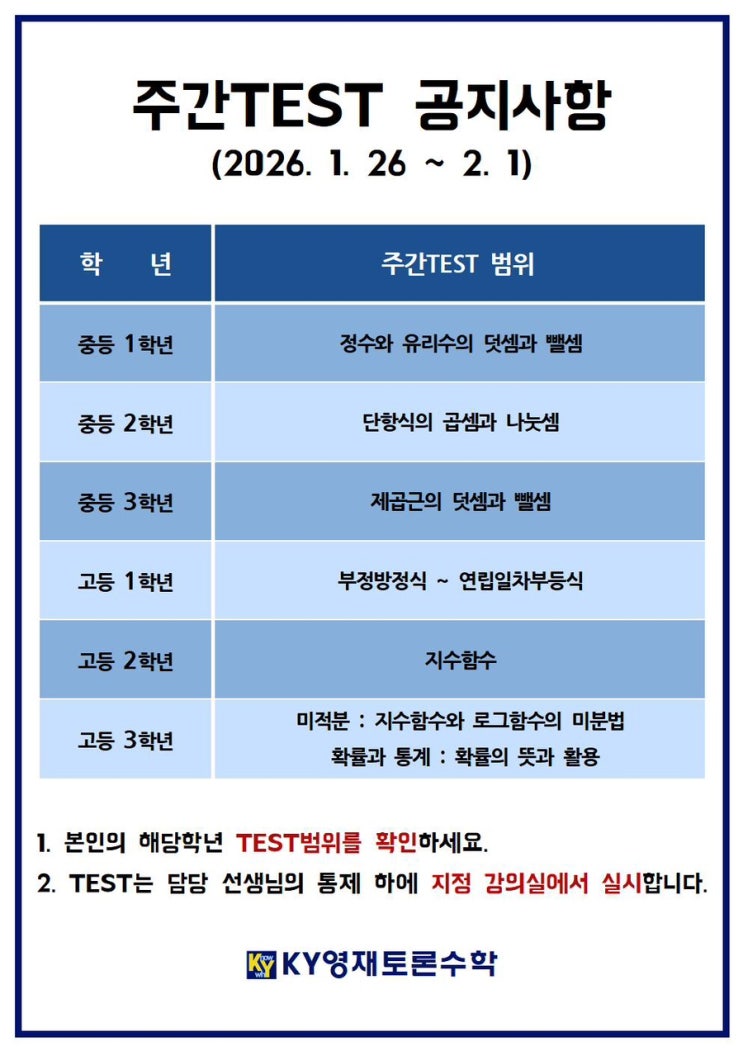 2026년 1월 4주차 주간테스트 공지사항