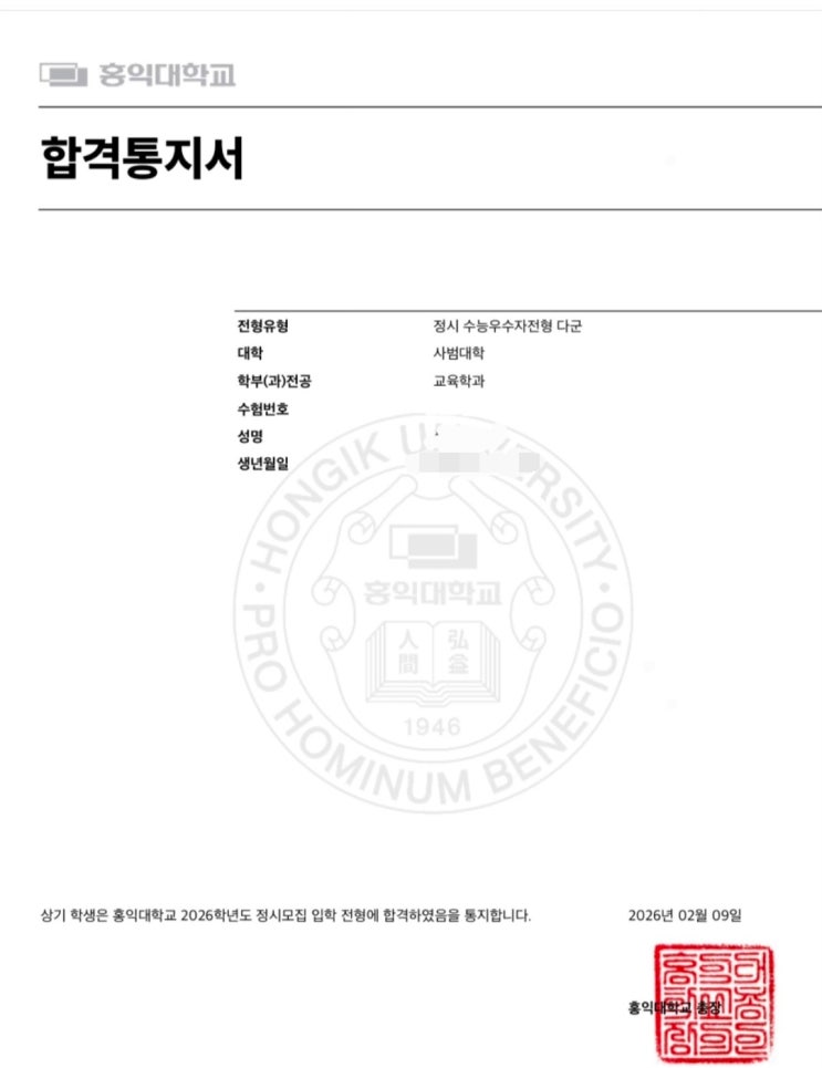 2026학년도 정시 합격 홍익대학교 사범대학 교육학과
