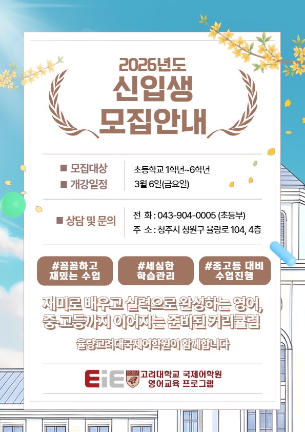 초등부터 탄탄하게 준비하는 중고등 영어의 실력 안녕하세요 율량고려대국제어학원입니다. 우리 아이 영어, '배우는 시간'만큼 '익히는 시간'도 중요합니다. 율량고려대국제어학원은 오프라인 수업과 온라인 보강을 통해 배운 내용을 체계적으로 자기 것으로 만듭니다. 아이의 현재와 미래를 함께 설계하는 영어 교육을 약속드립니다. ▶ 모집대상 ✔ 초등 1학년 ~ 6학년 ▶ 개강일정 ✔ 3월 6일(금요일) ✔ 주5회 수업 - 저학년 : 온라인보강 40분 / 정규수업 40분 - 고학년 : 온라인보강 45분 / 정규수업 45분 ※ 정확한 반 편성은 레벨 테스트 후 안내드립니다. ※ 정확한 수업시간의 경우 아이들의 레벨 및 반에 따라 다....... <img src="https://blogthumb.pstatic.net/MjAyNjAyMjNfOTAg/MDAxNzcxODM5MDc4NTEz.7u_BZ06gXj3IchQFAb5DvUHd5eNcRuoauF_eY8RskpYg.6HVTnTDorsCCOOtnhr5ADl78iUwqYyjAxQ2BZxijg60g.JPEG/%C3%CA%B5%EE%B0%FC2026%BD%C5%C0%D4%BB%FD%B8%F0%C1%FD%BE%C8%B3%BB_.jpg?type=s3" />