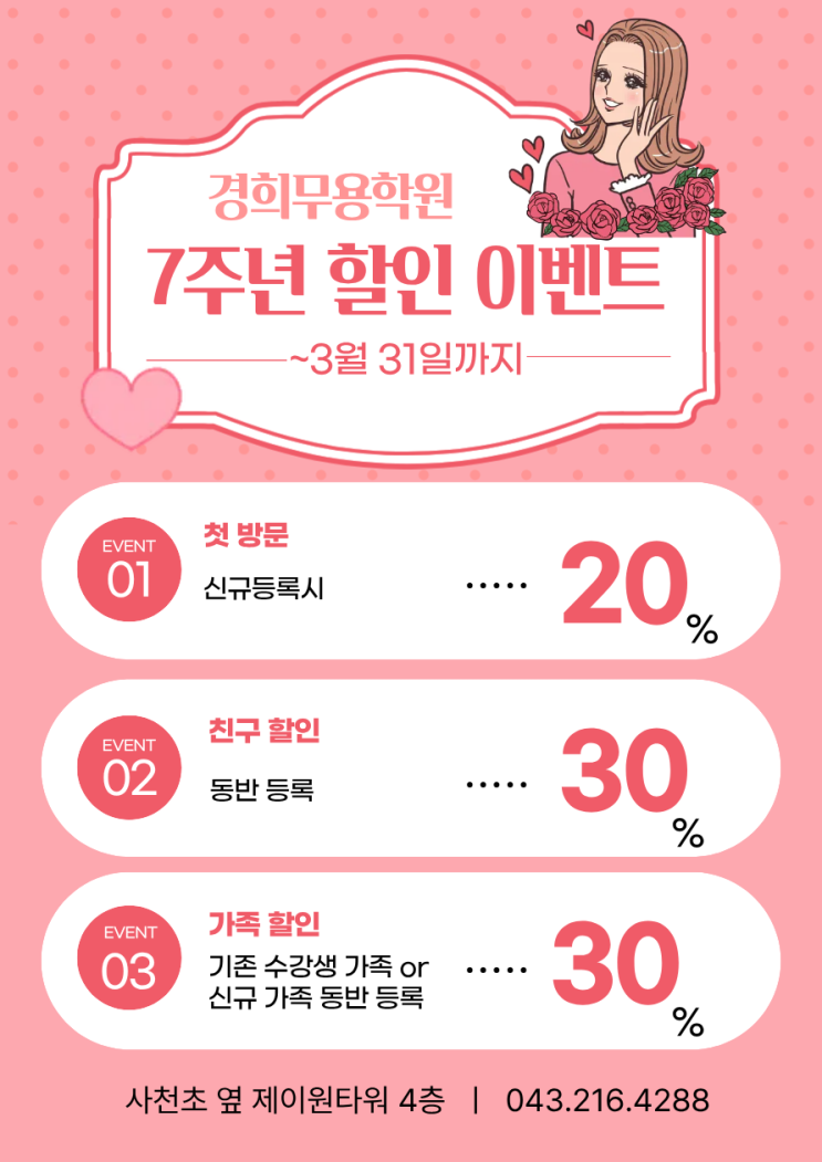 경희무용학원이 학부모님들과 회원님들의 소중한 관심과 함께 어느덧 7주년을 맞이했습니다 그동안 보내주신 사랑에 감사드리며, 더 많은 분들과 발레의 즐거 움을 나누고자 7주년 기념 특별 할인 이벤트를 진행합니다. ✨ 7주년 특별 혜택 ✔ 신규 등록 ▶ 20% 할인 ✔ 친구 동반 등록 ▶ 30% 할인 ✔ 기존 수강생의 가족 or 가족 동반 등록 ▶ 30% 할인 혼자 시작하기 망설여졌던 분들, 지인과 함께라면 더욱 즐겁게 시작하실 수 있어요 주변에 발레를 고민하셨던 분들께 이번 기회를 편하게 소개해주세요 이벤트 기간 : 3월 1일 ~ 3월 31일 앞으로도 즐겁고 꾸준히 함께할 수 있는 경희무용학원이 되겠습니다. 감사합니다....... <img src="https://blogthumb.pstatic.net/MjAyNjAyMjdfMTI3/MDAxNzcyMTg1MjU1OTYw.V3V55gt1Fa-Dxz4fFW3QVZlOUgImPVBYoqKoACup19Mg._wCZ8YdTXAozB69RJkpHyYCrK0y-pDCAZGmFkHbrabQg.PNG/333333.png?type=s3" />