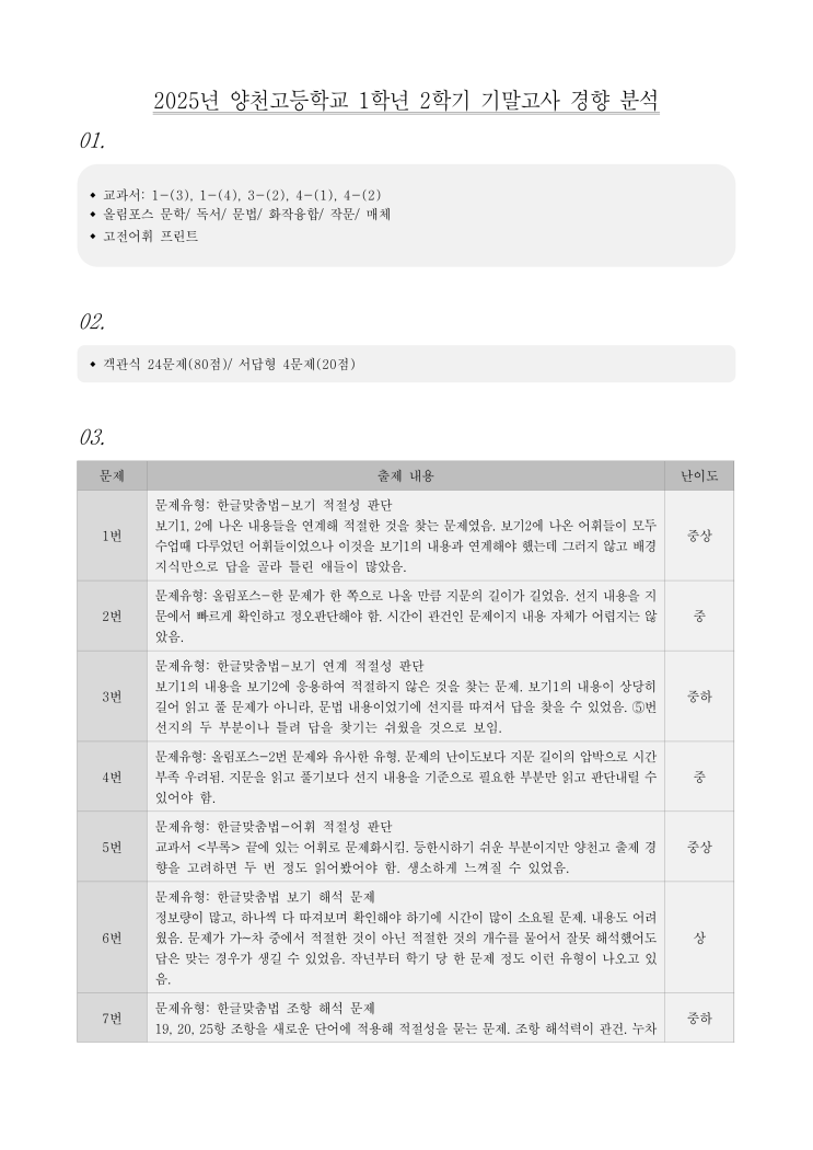 안녕하세요. 조지형 국어학원 양천고 담임 신현수T 입니다. 아래는 양천고 담당 선생님이 직접 분석한 2025학년도 양천고 1학년 2학기 기말고사 분석 자료 입니다. 조지형 학원은 철저한 경향분석을 바탕으로 다가올 26학년도에도 최선의 노력으로 대비해나가겠다는 것을 약속드립니다. 국어 성적과 관련하여 궁금하신 점이 있으실 경우 언제든지 학원에 문의하여 주시면 성심껏 상담하여 드리겠습니다. 열정과 노련함으로 학생들의 성적을 반드시 올리겠습니다!! 감사합니다. 다른 학원과 다른 강의! 다른 학원과 다른 컨텐츠! 다른 학원과 다른 관리! 성적을 반드시 올려주는 극강의 관리를 경험하십시오! 열정과 효율로 학생의 성적을 반드시....... <img src="https://blogthumb.pstatic.net/MjAyNTEyMjVfMTAy/MDAxNzY2NjQ5NTY5ODk5.uqyerp8fs7Jsn7b5r0Zm3wOb9Dp3QYAtuzwOBKTXd2og.eYMipss8ESDA3pzbFKcsHGvLXvmdtiR3dyN0jlkVutEg.PNG/%C3%E2%C1%A6_%B0%E6%C7%E2_%BA%D0%BC%AE_%BE%E7%C3%B51%282%C7%D0%B1%E2_%B1%E2%B8%BB%29_1.png?type=s3" />