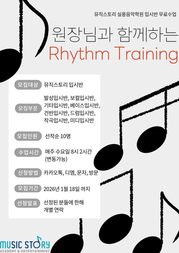 안녕하세요~뮤직스토리 원장 고재규입니다~~ 지난 20년동안 입시를 가르치면서 아이들이 가장 힘들었던 부분은 리듬영역이었어요~곡 카피를 하거나 솔로를 만들거나 어려움을 많이 느끼고 특히 즉흥연주를 할때 리듬적인 아이디어가 많이 부족하니까 단순하고 심심한 플레이가 나오더라구요~ 그래서 뮤직스토리 입시반 학생들은 리듬은 확실히 이해할수있는 수준을 만들고 싶어서 리듬트레이닝이라는 수업을 준비했습니다~ 과정은 3단계로 준비했어요~ 레벨1 음표와 쉼표의 이해와 리듬 트레이닝 레벨2 다야한 리듬을 이용한 솔로연주 만들기 레벨3 각 장르의 특징적인 리듬 이해와 응용리듬 만들기 이렇게 준비했습니다~ 우리 아....... <img src="https://blogthumb.pstatic.net/MjAyNjAxMDZfMjg2/MDAxNzY3NjkyMDYyMDM1._yrAbaqaJtSBpHdblC7tbFNL07BgskFwEdiKG2ABow8g.r81lZLM7B822_XKB6F0S2cFbb2kL5LBaGt1m5O-bBUsg.JPEG/%B8%AE%B5%EB%C6%AE%B7%B9%C0%CC%B4%D7.jpg?type=s3" />