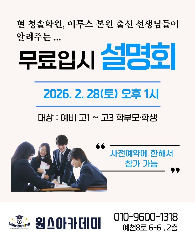 안녕하세요, 26년 1학기 시간표 안내드립니다. 전 학년 정원이 모두 마감되었습니다. 1학년 35기: 1월부터 대기 중이신 분들께 순차적으로 연락드리고 있습니다. 2학년 34기: 작년 12월에 대기 문의 주신 분들까지 안내를 완료했습니다. 3학년 33기: 현재 마감 상태이나, 요일 편중으로 금요일 반 희망 시 등록이 가능합니다. 대기 인원이 많아 모든 분들께 개별 연락을 드리지 못한 점 너른 양해 부탁드립니다. 아울러 온라인 수업(실시간 / 녹화본) 등록도 가능하며, 온라인 수강 시 수업료 10% 할인이 적용되오니 참고해 주시기 바랍니다. 궁금하신 사항은 언제든 편하게 문의부탁드립니다. 다만, 1인학원이라 수업중일때 전화를 받지 못하니....... <img src="https://blogthumb.pstatic.net/MjAyNjAyMTlfMTM0/MDAxNzcxNTEwMTQ1MzA4.FmcSb6NPQEBZMOC_HkH63REXQlNDt9YbL7mfYwev1iAg.tAX8i7fFe20Ztp8soV9K5chVqUlBQgukKDGYsNicGiAg.JPEG/%C1%A6%B8%F1%C0%BB-%C0%D4%B7%C2%C7%D8%C1%D6%BC%BC%BF%E4_-002.jpg?type=s3" />