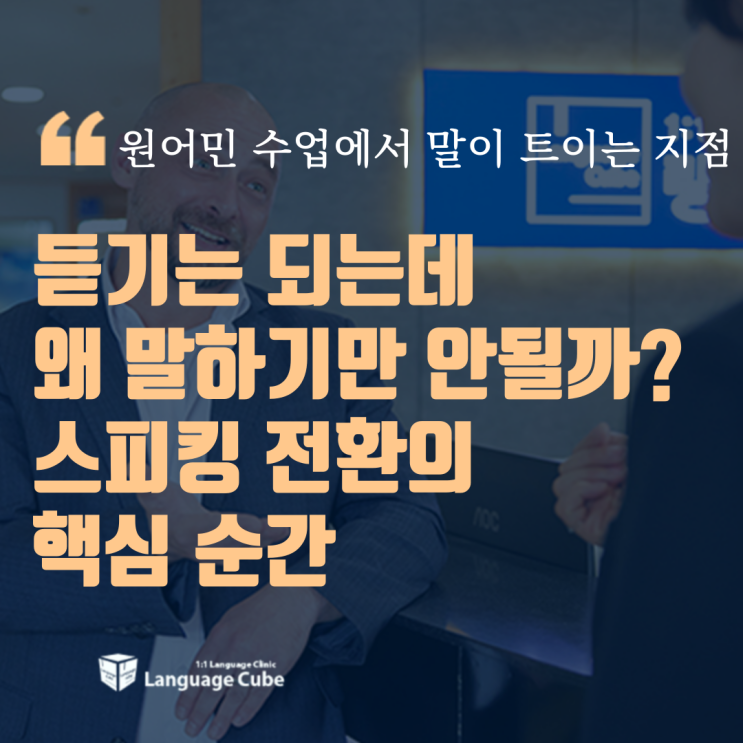 원어민 회화 수업, 듣기만 하던 영어가 드디어 '말로 바뀌는 순간' 직장인분들과 상담하다 보면 가장 자주 듣는 말이 있습니다. "영어 듣기는 어느 정도 되는데, 말하기만 안 돼요." 이건 개인의 문제가 아니라 한국 성인 학습자의 구조적 특징에 가깝습니다. 실제로 글로벌 교육 리포트에서도 성인 학습자의 67%가 '리스닝은 되는데 스피킹은 막힌다'고 답했죠. 출퇴근길 영어 콘텐츠 덕분에 듣기는 빨리 늘지만, 말하기는 실제 환경이 없으면 거의 정체됩니다. 하지만 원어민 회화에서는 스피킹이 갑자기 열리는 '전환 지점'이 분명히 존재합니다. 이 지점을 잘 설계하면 지금까지 말이 막히던 분도 짧....... <img src="https://blogthumb.pstatic.net/MjAyNTEyMTZfMTk0/MDAxNzY1ODE1MTk3MjA0.17CLqMLV44JPoSWsH81UYYBl6PLpiLwo6rhB_bVL6lcg.z_581NR8YuxuhlSVu-06Ew0Kq7Grpk95IjcwgeEPY8Qg.PNG/001.png?type=s3" />