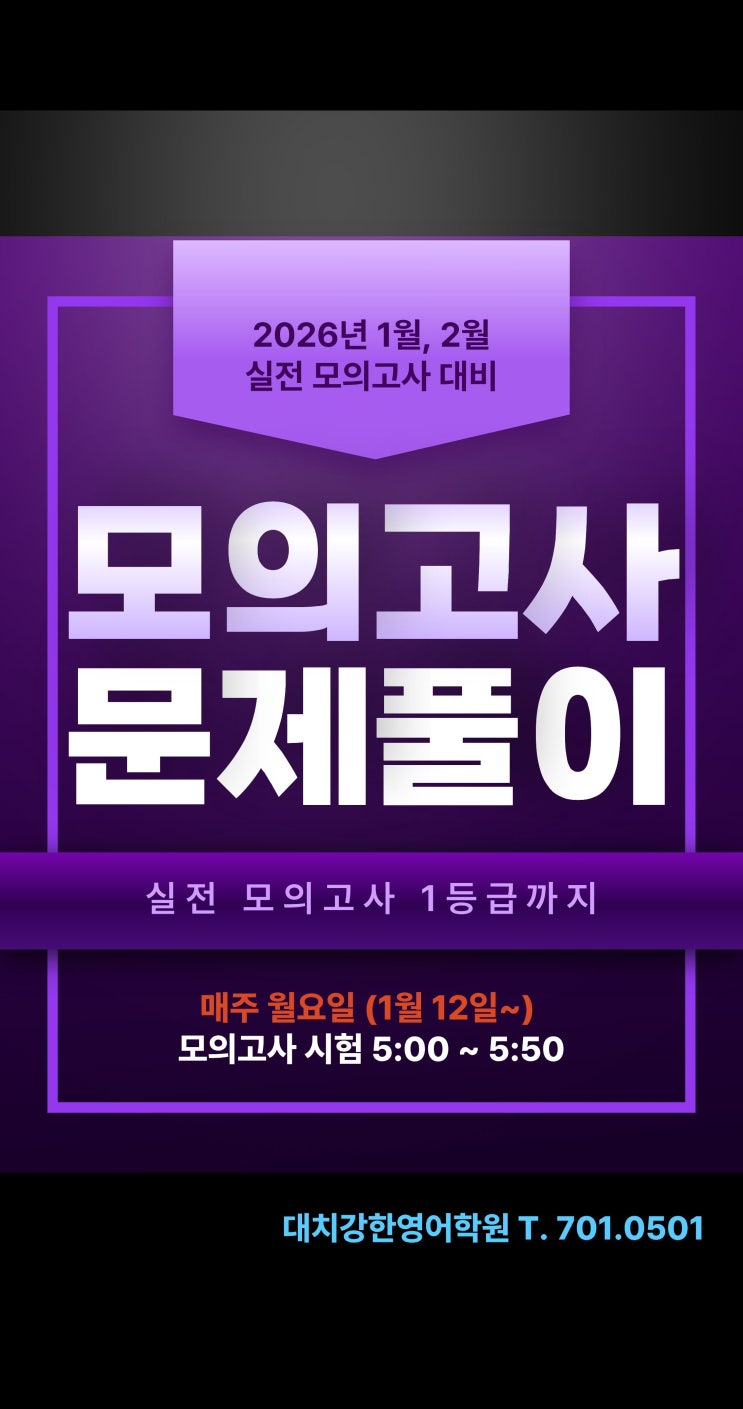 무료 모의고사 문제 풀이 예비 고1 모의고사 실전 대비입니다. 매주 월요일 5시부터 50분 동안 (듣기 제외) 실전과 똑같이 모의고사 시험을 진행합니다. 그 뒤에 모의고사 풀이가 진행됩니다. 고등학교 입학 전 모의고사 완벽하게 끝내고 입학 하겠습니다. 초, 중, 고 영어전문 대치강한영어학원 02.701.0501 <img src="https://blogthumb.pstatic.net/MjAyNjAxMDdfMTM0/MDAxNzY3NzkwNzAyMjEy.Z_KYCjlDyE7TSk30O39enjK-uTTa_ziCRPXX7BiN-jgg.Glj78MwUW0jNXWbF50CkOfdCwIUD7oTDIJZXtXpqLIMg.JPEG/%B8%F0%C0%C7%B0%ED%BB%E7.jpg?type=s3" />