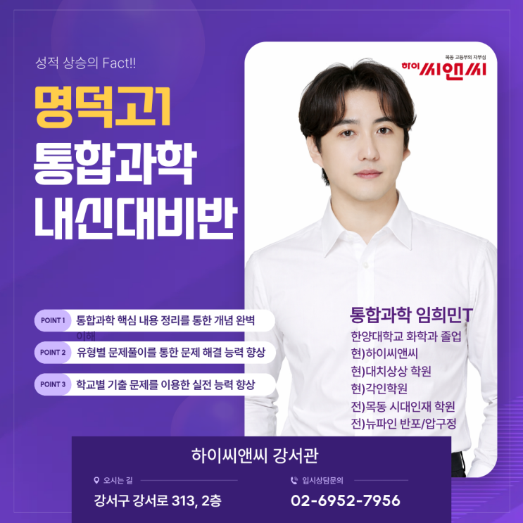 명덕고1학년 통합과학 중간고사 기출 완벽 적응 1. 통합과학 핵심 내용 정리를 통한 개념 완벽 이해 2. 유형별 문제풀이를 통한 문제 해결 능력 향상 3. 학교별 기출 문제를 이용한 실전 능력 향상 ▶ 매 주 간단 Test 진행 및 강사 대면 클리닉 진행 ▶ 복습용 강의 영상 제공 ▶ 전화 및 sns를 이용한 질의응답 하이씨앤씨 통합과학 임희민T - 한양대학교 화학과 졸업 - 현)하이씨앤씨 - 현)대치상상 학원 - 현)각인학원 - 전)목동 시대인재 학원 - 전)뉴파인 반포/압구정 https://blog.naver.com/gohicnc/224148006652 #명덕고 #내신대비 #통합과학 #임희민 #중간고사 #기말고사 #기출 #유형 <img src="https://blogthumb.pstatic.net/MjAyNjAyMjdfMjE0/MDAxNzcyMTc3MTU4NDk5.nMjBC6-Yoi9rAP7mGn4DKhAnUxSVadeJvW5Cckq_xw8g.7lKqVG7CTyZBtWX2J0awJUrB3XoN7HZ39IW8rp1Xal4g.PNG/%C0%D3%C8%F1%B9%CE.png?type=s3" />