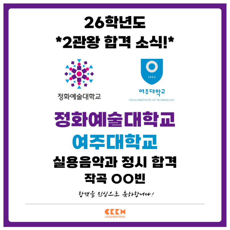 안녕하세요. 고척동과 신정동 경계선에 위치한 이때실용음악학원입니다. 소식이 조금 늦었지만 여주대에 붙었던 친구가 정화예술대학교까지 합격을 해서 늦게나마 합격 소식 전해드립니다ㅎㅎㅎ 1년도 안되는 짧은 시간안에 여주대, 정화예대까지 2관왕이라니! 너무 축하하고, 앞으로도 멋진 음악인으로 성장해나가길 바랍니다 보컬 | 피아노 | 기타 | 베이스 | 작곡 | 미디 현역 아티스트가 진행하는 1:1 맞춤 수업. 원장님이 직접 수업을 진행하므로 방문 상담은 100% 예약제로 진행합니다. (전화 부재 시 문자나 카톡, 네이버 톡톡으로 문의 부탁드립니다) <img src="https://blogthumb.pstatic.net/MjAyNjAzMDZfMTE0/MDAxNzcyNzc4Mjg1NTI1.-N2y-BYZo-fkLpxUbv7_MXfCgaaZkMwZ2UzlcDtTdt0g.MADM6d1ev-WHq8jVIpSRoppKIj4ZRKLv1SelNkrNy1Ug.PNG/%C1%A6%B8%F1%C0%BB_%C0%D4%B7%C2%C7%D8%C1%D6%BC%BC%BF%E4._%2844%29.png?type=s3" />