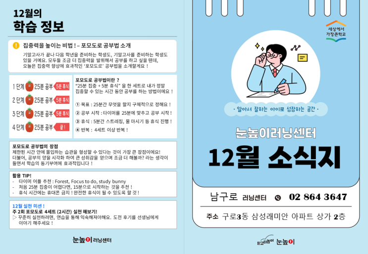 안녕하세요 . 눈높이 러닝센터 남구로 학원입니다. 벌써 2025년을 마무리하는 12월이 되었습니다. 새학년을 준비하는 눈높이 남구로 학원이 되겠습니다. 12월 6일 영어 말하기 대회 진행합니다 신청은 센터로 02 864 3647 11월 국어 어휘력 평가 대회를 진행했습니다. 참가한 모든 친구들 고생했습니다. 200문제의 어휘를 테스트하는 대회였습니다. 학교 교과에 나오는 어휘는 생각 보다 어렵습니다. 눈높이 어휘력 프로그램으로 미리 미리 책 읽고 공부하는 습관을 만들어 주세요. 겨울 방학 특강 안내입니다. 신청은 센터로 해주세요. 11월 단원평가 우수 회원 입니다. 눈높이 러닝센터 남구로 학원 02 864 3647 <img src="https://blogthumb.pstatic.net/MjAyNTExMjhfMTQy/MDAxNzY0MzA2NDg4MTMz.oYqLD3c8W2YSpCvsiFCpRaxeGxnNl4-hDlifQYipUC0g.g_sxS7eRAofjRSsAnaQxsFmnTwVfYFbWXEgL3g1cAAcg.PNG/%BD%BD%B6%F3%C0%CC%B5%E51.PNG?type=s3" />