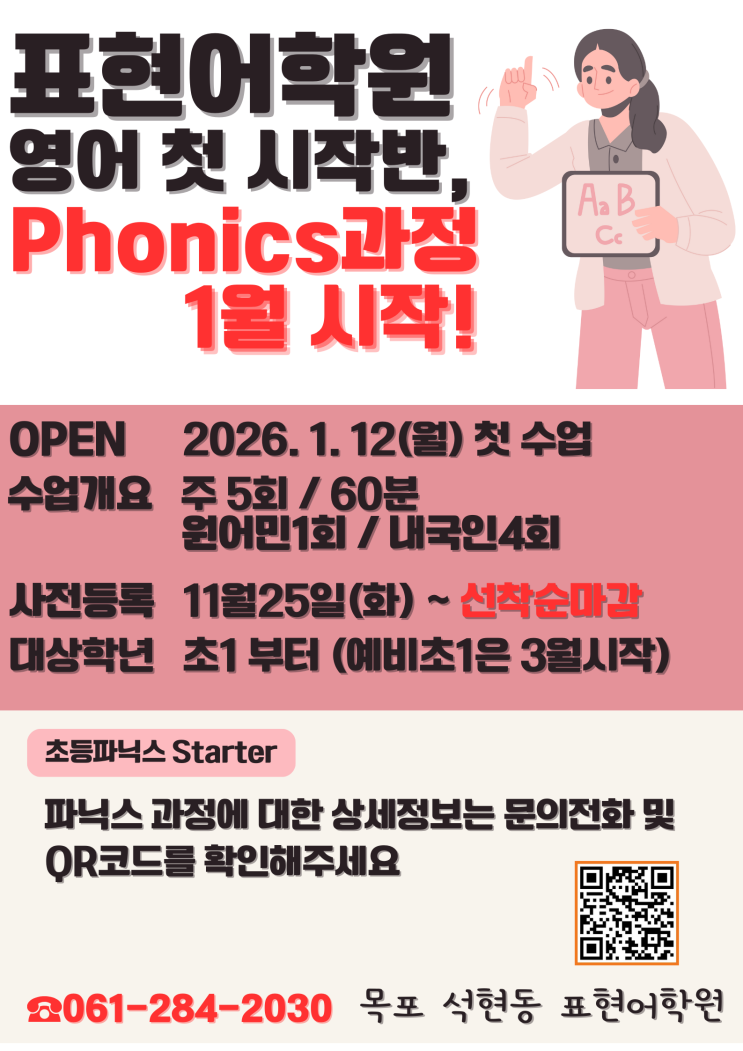 목포 표현어학원 신규 파닉스반 26년 1월 OPEN ! 목포 석현동에서 초·중·고 영어 전문 학원을 찾고 계시다면 아이들의 영어 첫걸음을 가장 안전하게 책임지는 석현동 파닉스 전문 어학원 표현어학원 소식을 주목해 주세요! 2026년 상반기 첫번째! 신규 파닉스반 오픈 개강일 : 26년 1월 12일(월) 대상 : 영어를 처음 시작하거나 다시 배워야 할 친구들 ✅ 레벨: 파닉스 기초반 반 별 정원 : 8명 ☎️ 등록 전화 문의 ▲위 링크를 눌러주시면 전화 연결 됩니다 이미 대기등록 한 친구들이 있어 빠른 마감이 예상 됩니다! 2026에 개설되는 첫번째 파닉스 기초반이니 등록을 조금만 서둘러 주세요! 목포 석현동 표현어학원의 파....... <img src="https://blogthumb.pstatic.net/MjAyNTExMjRfMjI1/MDAxNzYzOTc4NzcyODIz.ZFwkrDzmvNcQFIumGQHNq9CUQdMknpBTGW3eJRQNSMYg.P_j7zAZHnQ6n4K6Air2dqTE_ev2_ElkRJkY7dWItO1gg.PNG/%BF%B5%BE%EE_%B1%B3%C0%B0_%C0%CF%B7%AF%BD%BA%C6%AE_%BF%B5%BE%EE_%C7%D0%BF%F8_%BF%F8%BB%FD_%B8%F0%C1%FD_%C6%F7%BD%BA%C5%CD_%281%29.png?type=s3" />