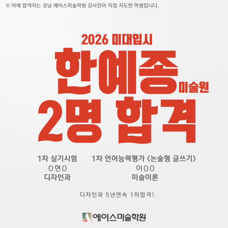 2026 한예종 미술원 한국예술종합학교 (한예종) 미술원 디자인과 1차 실기시험 1명 합격 O현O 한국예술종합학교 (한예종) 미술원 미술이론 1차 언어능력평가<논술형글쓰기> 1명 합격 이OO <img src="https://blogthumb.pstatic.net/MjAyNTEyMDRfMTc1/MDAxNzY0ODM5NjUyMzYw.TQWQdChcE11RlHjf41vPR7aUbQozqTPTz2BoHu8A1Mwg.e9GWpKDaicHzVbl8Jk99ApJVOtU-YOQu7zF7-De_BJAg.PNG/2026_%C7%D1%BF%B9%C1%BE_%B5%F0%C0%DA%C0%CE%2C_%B9%CC%BC%FA%C0%CC%B7%D0_%C7%D5%B0%DD_%BF%A1%C0%CC%BD%BA%B9%CC%BC%FA%C7%D0%BF%F8.png?type=s3" />