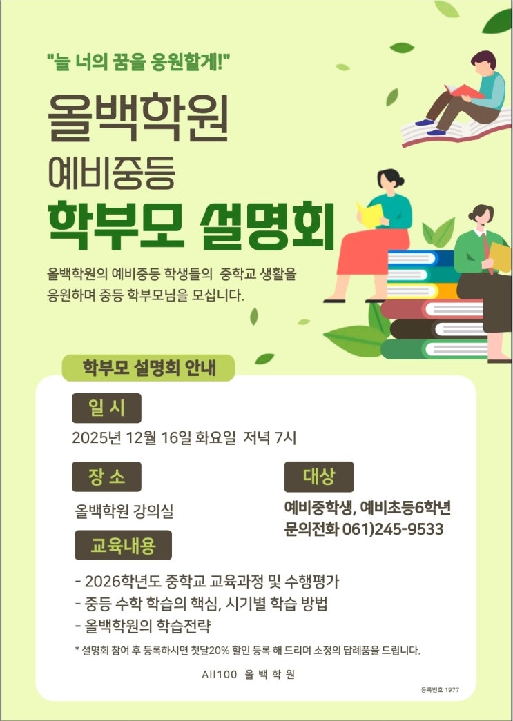 올백학원 예비 중학생 학부모 설명회 새로운 시작을 함께 준비하는 시간 안녕하세요, 올백학원입니다. 12월이 되면 학원 분위기에도 작은 변화가 찾아옵니다. 올해를 마무리하는 아이들의 표정 속에는 설렘과 걱정이 함께 떠다니고, 예비 중학생이 될 친구들은 조금씩 ‘새로운 시작’을 준비하는 마음가짐이 보이기 시작하죠. 부모님들도 아마 같은 마음이실 거예요. “우리 아이, 중학교에서 잘 적응할 수 있을까?” “첫 시험, 첫 성적… 어떻게 준비해야 할까?” 이런 고민이 자연스럽게 떠오르는 시기이기도 합니다. 그래서 올백학원은 예비 중학생 학부모님들을 위한 따뜻한 설명회를 준비했습니다. 아이들이 중학교라는 새로운 환경에서 흔....... <img src="https://blogthumb.pstatic.net/MjAyNTEyMDdfMjE4/MDAxNzY1MDgzODU2MDkw.s0plECzYX-0vQhFWbm65BP29hj8D3WeFUHAlaX3CLH0g.RhxpusNfnilzGMTOyQ8kPFQ47gmLTTeFZ0pZpB_GlVQg.JPEG/KakaoTalk_20251206_073803275.jpg?type=s3" />