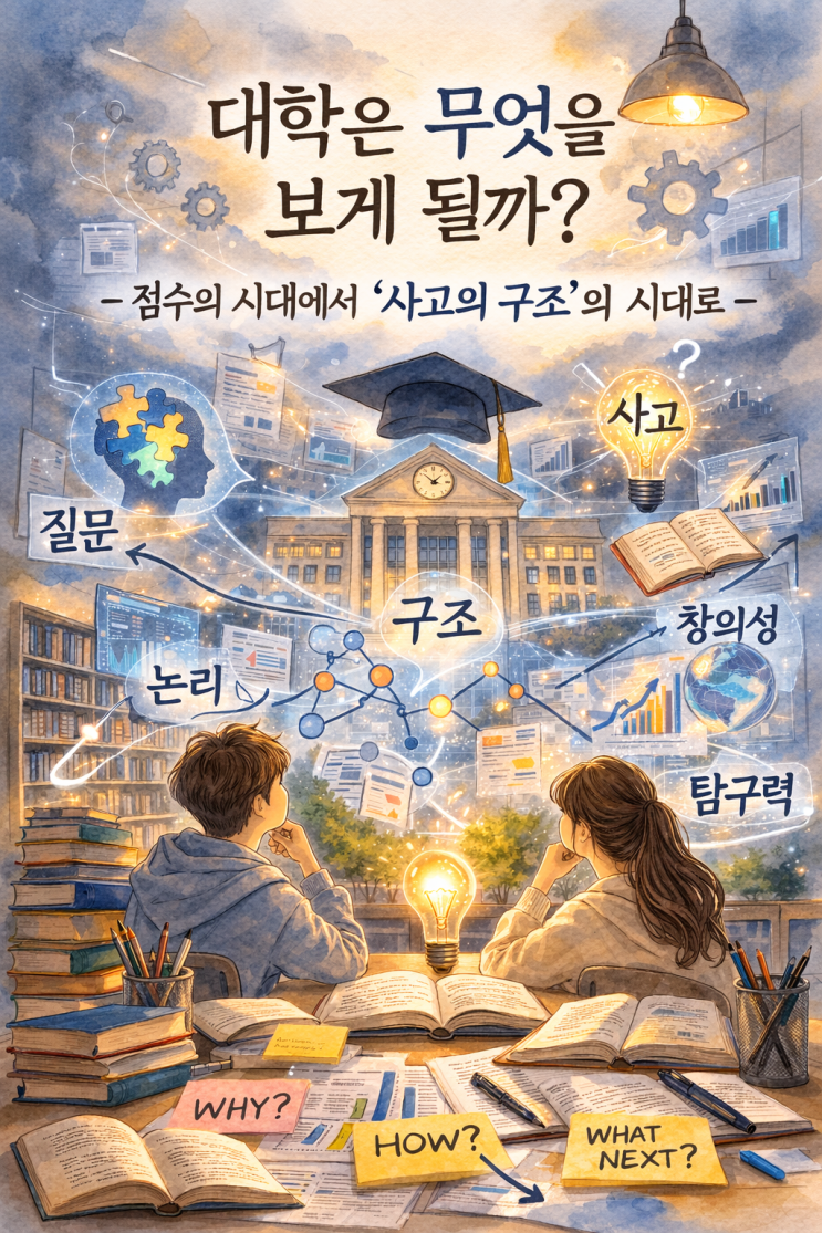6부 대학은 무엇을 보게 될까? – 점수의 시대에서 ‘사고의 구조’의 시대로 많은 학부모님들은 여전히 이렇게 생각합니다. “결국 대학은 성적을 보지 않나요?” “내신과 수능 점수가 가장 중요하지 않나요?” 맞습니다. 점수는 여전히 중요합니다. 하지만 한 가지가 바뀌었습니다. 대학은 이제 ‘점수의 결과’보다 ‘점수를 만든 구조’를 보기 시작했습니다. 상위권 대학이 묻는 것 최근 입시 흐름을 보면 공통적으로 나타나는 변화가 있습니다. 서술형 확대 논술형 사고력 평가 면접 심층 질문 강화 탐구 활동 중심 평가 이 모든 변화의 공통점은 하나입니다. 단순 정답 능력이 아니라 사고의 깊이와 구조를 보겠다는 것 입니다. 왜 대학....... <img src="https://blogthumb.pstatic.net/MjAyNjAzMDFfMTk3/MDAxNzcyMzYzODE5ODQ3.xwOcFdHJkm8MyuF7JJNapscCqwnoe3xqPYcsv1krNjIg.GIi3hrFXbbC8YutrrbOHwTrtoCYHoKnLYdRXUt1K0WUg.PNG/image.png?type=s3" />