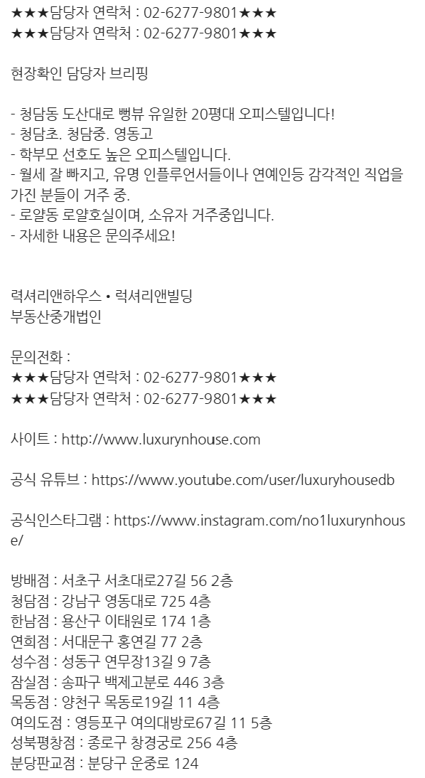 [ 기본 정보 ] ***거래 타입 : 매매 (오피스텔) ***매매가 15억 5천 (해당 건물의 로얄층 로얄호실) ***기본 정보 : 계약면적 129.62㎡/67.05㎡(전용률52%) / 전용 면적 39.21평/20.28평(전용률52%) ***해당층/총층 : 고층 / 15층 ***방 2개 / 욕실 1개 ***관리비 : 65만원 ***방향 : 동향 (거실기준) ***입주가능일 : 즉시입주 (소유자 거주중) ★★★담당자 전화번호 02-6277-9801★★★ ★★★담당자 전화번호 02-6277-9801★★★ [ 키워드설명 ] 청담동에서 전용 20평대 나오는 매우 희소합니다. 명품거리! 슬리퍼신고 5분컷으로, 명품 매장에 1억정도 묻어두신 분들이 세입자로 있었습니다! 토지거래허가제를 빗겨가서 갭투자 가능하니 서두....... <img src="https://blogthumb.pstatic.net/MjAyNTEyMDZfMTIz/MDAxNzY1MDIxNTExNjQ4.X9ri_EzWqNUGWeHaFdxZ2MC72MLZJAOkkRoPDOBhNWQg.xbLCVjZpmN3CfA5oXYS3mm5RM_mtJKEcLqoOm1aYclwg.PNG/image.png?type=s3" />