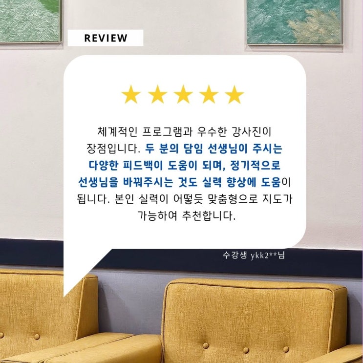 아래 글은 실제 수강생이 직접 남겨주신 후기입니다. 이 후기에 담긴 내용이 바로 메이븐랭귀지가 운영되는 방식 그대로입니다. 메이븐랭귀지는 ✔ 체계적으로 설계된 커리큘럼 ✔ 경험 많은 강사진 ✔ 2명의 담임 강사 시스템으로 한 방향이 아닌, 다양한 시각의 피드백을 제공합니다. 또한 정기적인 강사 로테이션을 통해 한 선생님에게만 익숙해지는 수업이 아닌, 실제 영어 실력을 끌어올리는 수업을 진행합니다. 영어를 잘하든, 이제 막 시작하든 수강생 한 분 한 분의 현재 실력과 목표에 맞춰 맞춤형으로 지도하기 때문에 부담 없이 시작하실 수 있습니다. 영어 공부, 혼자 고민하지 마세요. 이미 많은 수강생들이 선택하고, 직접 경험한....... <img src="https://blogthumb.pstatic.net/MjAyNjAxMDVfMTk2/MDAxNzY3NjA0NzIyNDky.UyQvy5EdXYwJibe16q-qqF2uj8Rcqb1TVucooN6Yi3sg.8LnIqsArxQKvlzcv0wrJx0XLzT3cu9rtewBwIe4N9Jkg.JPEG/6.jpg?type=s3" />