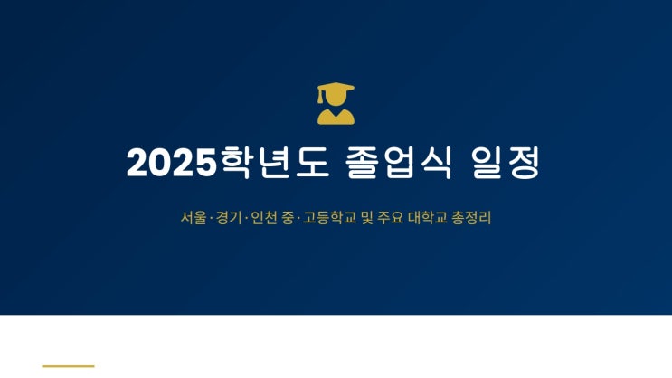 2025학년도(2025년 1월~2월 시행) 졸업식 일정에 대해 안내해 드립니다. 현재 교육청 지침에 따라 많은 중·고등학교가 1월 초에 졸업식을 마치고 바로 겨울방학 및 학년말 방학에 들어가는 '1월 졸업식' 추세가 강해졌습니다. 대학교의 경우 통상적으로 2월 중순에서 말일 사이에 학위수여식을 진행합니다. 각 학교마다 세부 일정은 운영위원회 결정에 따라 1~3일 정도 차이가 날 수 있으므로, 정확한 날짜는 해당 학교 홈페이지의 학사일정을 꼭 확인하셔야 합니다. *학교 홈페이지 일정 확인 서울,경기,인천 초중고 학교별 일정 확인 팁 중·고등학교: 학교 알리미(School Info) 사이트에서 학교명을 검색한 뒤 '학사 일정....... <img src="https://blogthumb.pstatic.net/MjAyNjAxMDZfMTk0/MDAxNzY3NzEwMDI3MTcx.RzP7Wu7GNx5vfPxrONZ96ZxUjUdD3cV4HYOAP9RebcYg.oWXG39wq62yLa5d5KthBAfebAMIovMli6k-qQdD63zMg.JPEG/2025_Graduation_Schedule_Guide_-_Google_Slides_1.jpg?type=s3" />