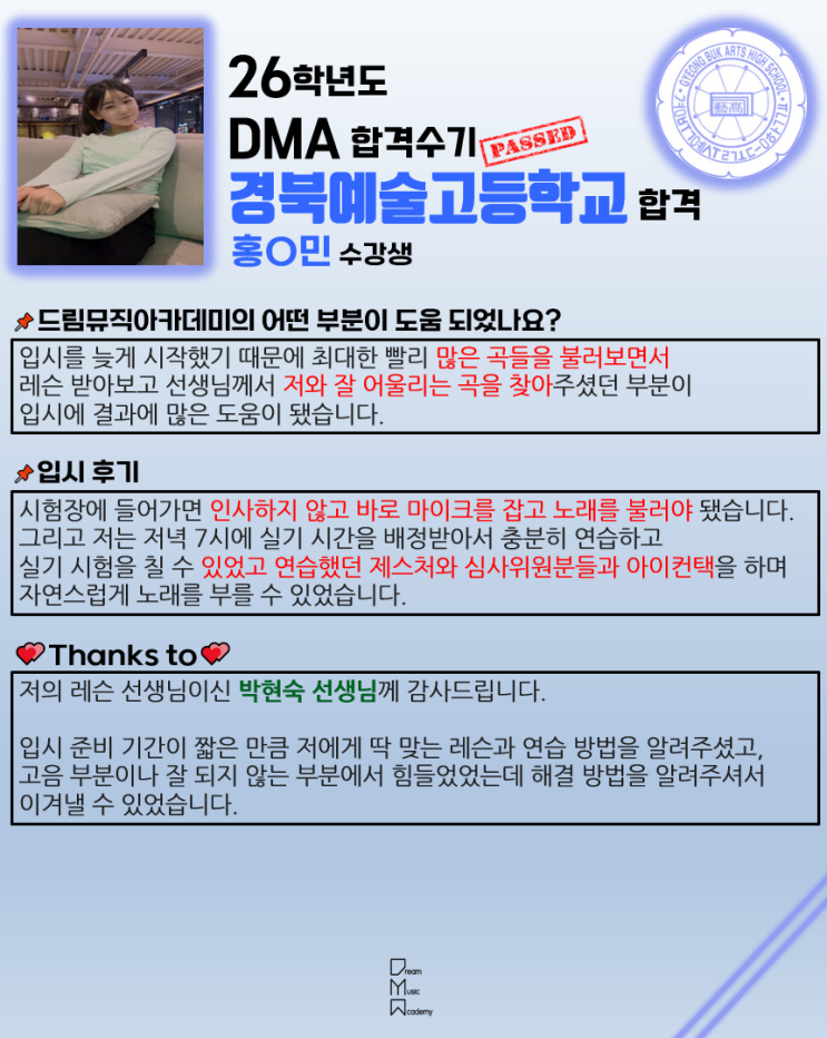 #경북예술고등학교 #실용음악과 #보컬 #합격 #경북예고실음과 #경북예고입시 #대구보컬학원 #대구실용음악학원 2026학년도 경북예술고등학교 실용음악과 보컬 합격 DMA 수강생 : 홍보민 입시 지도 잘 해주신 보컬 파트 : 박현숙 선생님 감사합니다 ✔경북예술고등학교 실용음악과 입시는 역시❗ 대구 드림뮤직아카데미❗❗ 여기로 문의해 주세요 ✅우리 대구 드림뮤직아카데미 에서는 음악 취미, 전문, 오디션, 입시 등 모든 과목을 체계적으로 배우고 준비할 수 있습니다! 대구 실용음악학원, 보컬 학원은 드림뮤직아카데미 ✅보컬 진단으로 수강생 맞춤별 강사님 배정 + 원장님, 부원장님....... <img src="https://blogthumb.pstatic.net/MjAyNTEyMDhfMjUy/MDAxNzY1MTg5NDE1MTc4.0dpzggMLvUVCcOdZ74FRPmLAWsYREewxthR9tUtHp-Ig.CkOr2GAeV-dffV4ZaLiOmLOfMGUFcvIi3pe-GZCbzycg.PNG/%C8%C4%B1%E21.PNG?type=s3" />