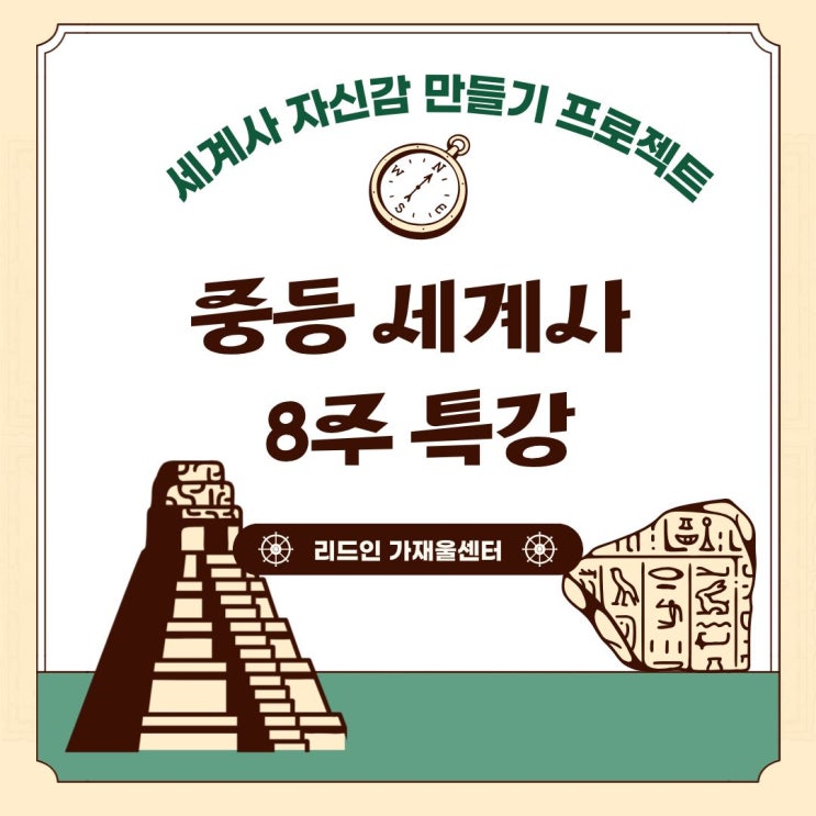 아이들이 가장 힘들어하는 과목, 무엇일까요? 수학, 영어가 떠오르지만 의외의 복병은 바로 '세계사'입니다. 중학교 2학년이 되어 세계사를 처음 접하면 아이들은 당황합니다. 낯선 지명과 인명, 감당하기 힘든 암기량 때문에 시험 기간 내내 불안감에 시달리기 때문입니다. 하지만 세계사는 단순 암기 과목이 아닙니다. 흐름을 이해하고, 사건을 연결하여 해석하는 인문학적 사고력이 핵심입니다. 이번 겨울방학, 중등 친구들 주목! 리드인 가재울센터가 무작정 외우는 고통에서 벗어나, '흐름'으로 세계사를 정복하게 해드립니다. 중학생이라면 누구나, 특히 세계사가 시작되는 '예비 중2'라면 이 수업은 선택이....... <img src="https://blogthumb.pstatic.net/MjAyNTEyMDNfNTgg/MDAxNzY0NzU3NTk1MDcy.Jkfug_EFjuAXHey9pGyreyEvDjfPM4bXtCdgDu9qJZcg.sTKe8CHWlcSi1iW34DWl_nIzCLP-ylojhO0qILItIO8g.JPEG/%BC%BC%B0%E8%BB%E7_%C6%AF%B0%AD.jpg?type=s3" />