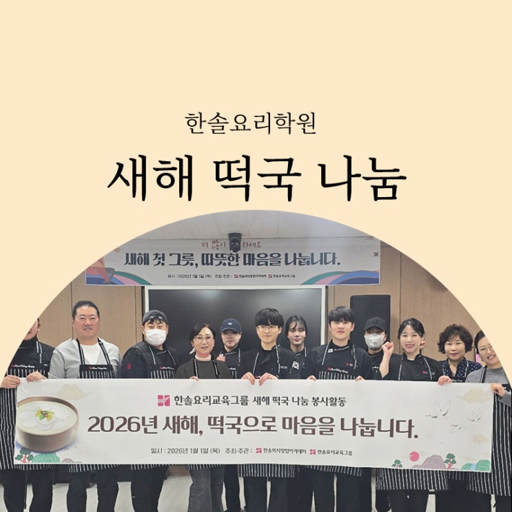1월의 시작은 한 해를 어떻게 열어갈지 조금 더 신중하게 생각하게 되는 시기입니다. 새해라는 말이 주는 기대 속에서 올해는 어떤 하루를 쌓아가고 싶은지, 어떤 선택으로 첫날을 맞이하면 좋을지 자연스럽게 떠올리게 되는데요. ◾ 한솔요리교육그룹은 2026년의 첫날을 말보다 행동으로, 의미 있는 실천으로 시작했습니다 ◾ 2026년 1월 1일 새해 첫날의 따뜻한 식탁 ◾ 1월 1일 ◾ 한솔요리교육그룹은 경영진과 임직원, 한솔요리학원 강사진이 함께 충남 홍성군 결성면을 찾아 지역 어르신들을 위한 떡국 나눔 봉사를 진행했습니다. 정성껏 준비한 떡국과 부침개 등 잔치 음식 300그릇이 새해 인사와 함께 식탁 위에 올려졌는데요. ....... <img src="https://blogthumb.pstatic.net/MjAyNjAxMDZfMjkz/MDAxNzY3NjY1OTI2NTQ0.JBmfPLCnIdLWzIKTmgv2hkmCCXYXQ60r-phRNXR5LDAg.nP37KjoK1sng6rMV1jHcg1NC18aIesjdF69pQJfnWfMg.JPEG/%B6%B1%B1%B9%B3%AA%B4%AE.jpg?type=s3" />