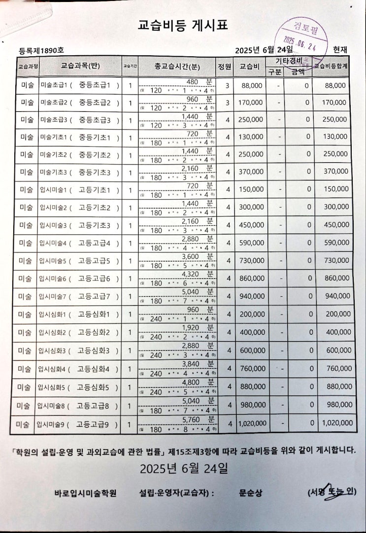 바로미술학원 교습비등 게시표 2025.6.24~