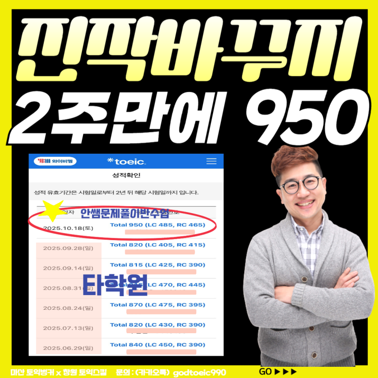 [마산 창원 토익 학원 추천] 2주 만에 950점_진작 바꿀걸!! 타학원 3댈 실패 후 안쌤의 문제풀이반 듣고!!