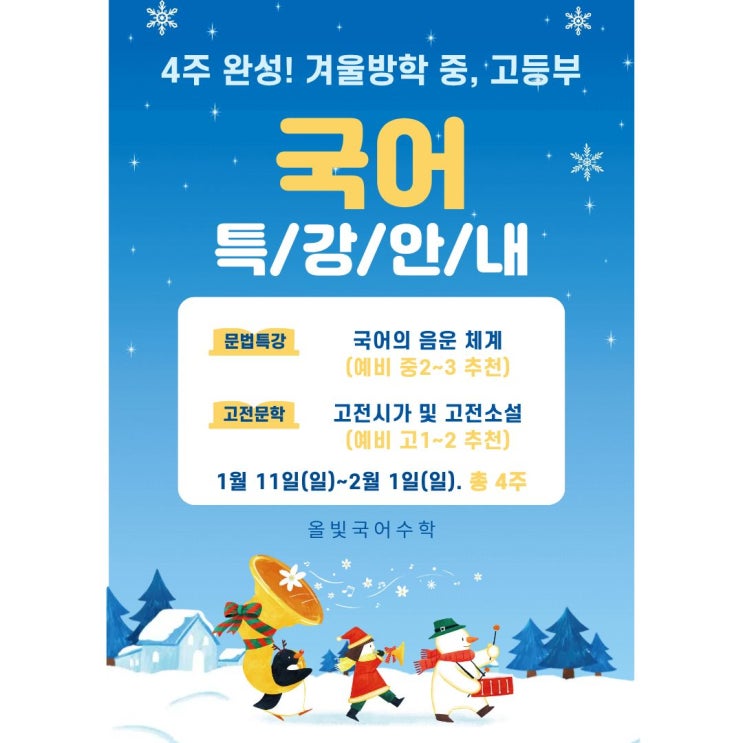 세상에 빛나지 않는 별은 없다! 안녕하세요. 진해 국어, 수학 학원 올빛국어수학입니다. 겨울방학 국어특강 인원 모집을 실시합니다. 1. 문법 특강: 국어의 음운 체계 1. 추천 대상: 예비 중2~예비 중3 *복습 또는 해당 내용의 학습이 필요한 학생도 신청 가능합니다. 2. 학습 내용: 국어의 음운 체계(문법) 3. 특강 일정 및 시간표 -1/11(일), 1/18(일), 1/25(일), 2/1(일). 총 4주 -오후 1:00~3:00 4. 수강료: 10만원(선납). 최대 9명(선착순 마감) 2. 문학 특강: 고전 시가 & 고전 소설 1. 추천 대상: 예비 고1~예비 고2 *복습 또는 해당 내용의 학습이 필요한 학생도 신청 가능합니다. 2. 학습 내용: 고전 시가 & 고전 소설(문학) *서....... <img src="https://blogthumb.pstatic.net/MjAyNTEyMDhfMTUy/MDAxNzY1MTg5NjAwNTgy.3GcsfiDsEO1wn_X1v1AT6tN3bZ4oGc8kPPe99vGs7s0g._y3F77SHczUAn11V-vvrhSq-9kXwLREs2-39w2uvQEEg.JPEG/%C1%A6%B8%F1%C0%BB_%C0%D4%B7%C2%C7%D8%C1%D6%BC%BC%BF%E4..jpg?type=s3" />