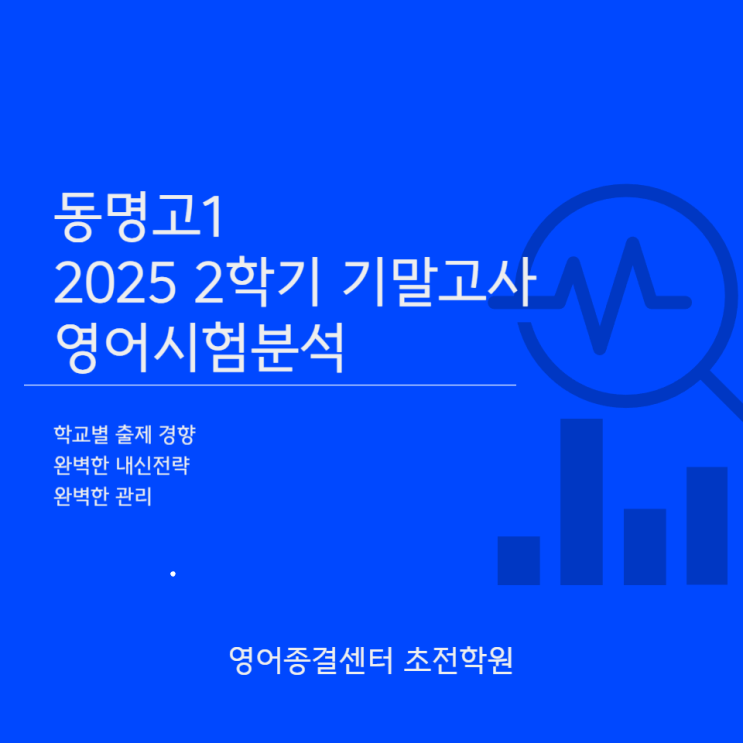 초전동영어학원, 학생, 학부모님 안녕하세요. 영어종결센터 초전학원입니다. 이번 25년 동명고 1학년 2학기 기말시험은 극과 극의 양극화가 뚜렷한 시험이었습니다. 객관식, 빈칸, 순서, 삽입, 일치는 쉬웠고, 서술형은 난이도가 꽤 높았습니다. 그럼 지금부터 초전동에서 가장 빠른 분석 영어종결센터 초전학원의 분석 시작합니다. 1. 문제 출제 비중 이번 동명고 시험은 모의고사 + 부교재 + 교과서가 고르게 섞인 구조였습니다. 모의고사 출처: 제목, 어법, 주제, 순서, 삽입, 일치 등 다수 부교재 출처: 빈칸 3문제, 일치, 순서, 요약, 흐름 교과서 출처: 어법, 영작, 영어질문, 요약, 어휘 이번 시험은 특정 한 자료에 치우치지 않고, ‘전....... <img src="https://blogthumb.pstatic.net/MjAyNTEyMDhfNzcg/MDAxNzY1MTk0OTk2Mzg3.X1WKpDek-xeoKii4mlN9qw_pbc-UvtnEqZehuamCVFIg.HIbMCEkcIpSeqsKQEuUgHbXPpAMKIP_cIXRGlZdQ1iMg.PNG/%C1%A6%B8%F1%C0%BB_%C0%D4%B7%C2%C7%D8%C1%D6%BC%BC%BF%E4_-001_%286%29.png?type=s3" />