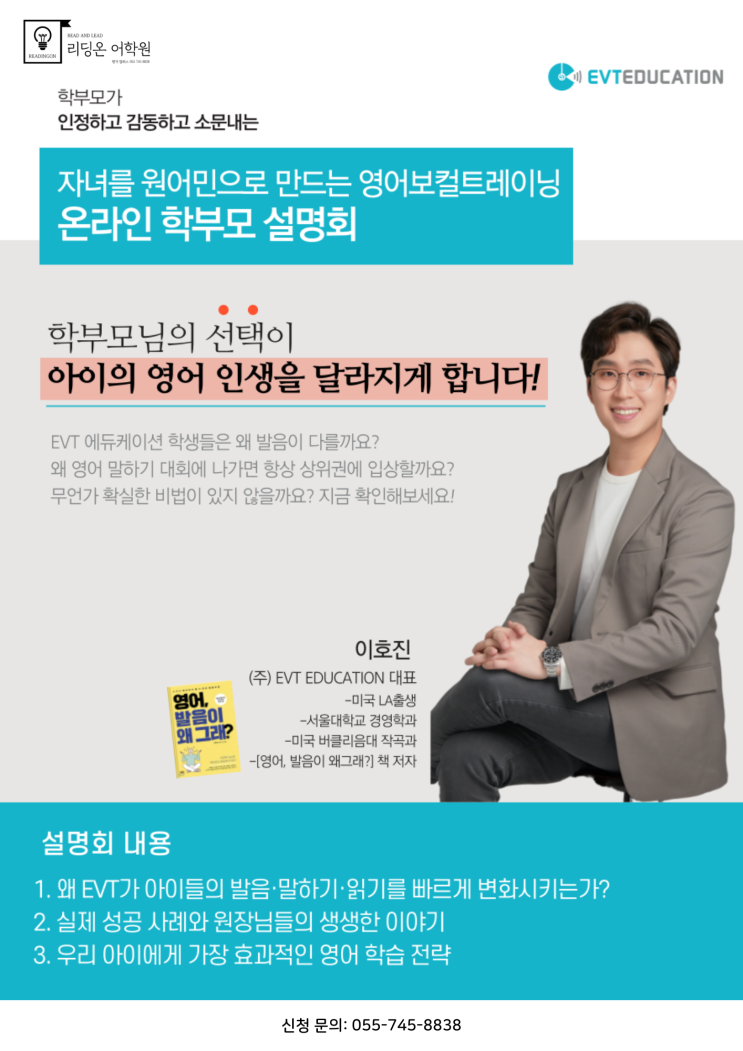 진주 평거동 영어말하기 전문 리딩온 어학원입니다. 우리 아이가 영어를 말할 때, 왜 리딩온 말하기 수업 아이들은 유난히 발음이 다르게 들릴까요? 왜 영어 말하기 대회만 나가면 늘 상위권을 놓치지 않을까요? 혹시... 남들은 모르는 확실한 비법이 있는 건 아닐까요? 사실, 있습니다. 그리고 그 비법을 부모님께 가장 먼저, 가장 정확하게 알려드리기 위해 이번 온라인 학부모 설명회를 준비했습니다. 자녀를 원어민으로 만드는 EVT 온라인 학부모 설명회 아이의 영어 인생은 '부모님의 한 번의 선택'에서 시작됩니다. 영어 앞에서 작아지던 아이가 어느 순간 또렷한 발음으로 말하기 시작하고, 자신감이 붙어 얼굴까지 환해지는 순....... <img src="https://blogthumb.pstatic.net/MjAyNTEyMDhfODQg/MDAxNzY1MTcyMjY2ODcx.FfpJn6KYuzdkz1XlEXwafONCmwbUUKCe7rS6So6-w0wg.4vGUPB-iFi6W2PvQhhcmPDjCu3tD74yFiD4iAEZX3iwg.PNG/%BD%C5%C3%BB_%B9%AE%C0%C7_055-745-8838.png?type=s3" />