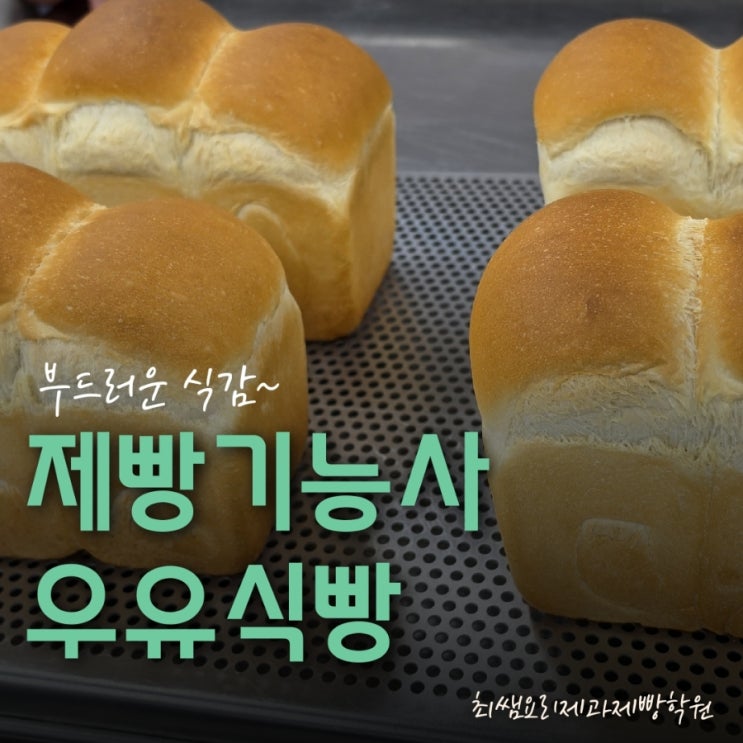 안녕하세요. 최쌤요리제과제빵학원입니다. 오늘은 제빵기능사 과정 중 하나인 우유식빵 수업을 진행했어요. 우유식빵은 기본 식빵보다 부드럽고 고소한 풍미가 좋아 많은 분들이 좋아하는 품목이에요. 제빵기능사를 준비하는 분들에게도 중요한 품목이라 반죽부터 성형까지 꼼꼼하게 설명하며 수업을 진행했어요. 먼저 재료 계량부터 시작했어요. 제빵에서 가장 기본이 되는 과정이 바로 정확한 계량이에요. 강력분, 우유, 물, 이스트, 설탕, 소금, 쇼트닝, 제빵개량제까지 필요한 재료를 하나하나 정확하게 계량했어요. 계량을 하면서 각각의 재료가 반죽에서 어떤 역할을 하는지도 함께 설명했어요. 계량이 끝난 뒤에는 반죽 작업을 진행했어요....... <img src="https://blogthumb.pstatic.net/MjAyNjAzMTZfMTg1/MDAxNzczNjQwMjE1ODQw.oEOGO5fxWyggaDkp4kWWBQdAHt4eXJWuDVki7ooT6nwg.cBAkO8JZV2ePM8qr18LipPTu9JnzePMTDwErWi6YMGQg.JPEG/900%A3%DF20260316144934.jpg?type=s3" />