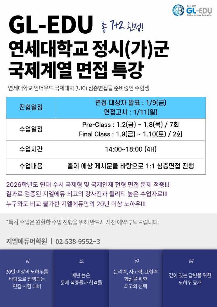 안녕하세요, 2007년부터 현재까지! 지엘에듀입니다. 오늘은 2026학년도 연세대학교 정시 국제계열 언더우드 국제대학 (UIC) 심층 면접 대비 강좌가 개설됩니다. 연대 언더우드 국제대학은 언더우드학부 (UD), 융합인문사회과학부 (HASS), 융합과학공학부 (ISE)로 구성되어 있으며, 자세한 내용은 아래 포스팅에서 확인하실 수 있습니다. 연대 정시(가)군 국제계열 전형안내 연대 언더우드 국제대학은 정시 '가'군에서 선발하며, UD 언더우드학부 (인문사회)와 HASS 융합인문사회과학부, ISE 융합과학공학부에 지원 가능합니다. 모집인원은 UD 10명, HASS 18명, ISE 20명을 선발하며, UD(생명과학공학)의 경우에는 수시 모집 미충원 인....... <img src="https://blogthumb.pstatic.net/MjAyNTEyMTBfMTgg/MDAxNzY1MzU1NjgyNTIz.BUm3N5bhEtAEW1Qf1olZ3uKhYJkvjqcI4hVvf1TtFtAg.VHJ5_bAoCkH1bagzUo9obR9Eoe_w542kuGAAVppkeYYg.JPEG/6.jpg?type=s3" />