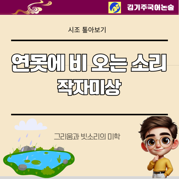 안녕하세요! 김기주 국어 주클래스입니다. 2027학년도 수능 특강에 수록된 작자 미상의 평시조, <연못에 비 오는 소리 ~>를 함께 분석해 보겠습니다. 이 작품은 빗소리라는 청각적 자극을 통해 '꿈'이라는 환상적 공간에서 현실로 돌아오는 화자의 허탈함과 임을 향한 그리움을 아주 감각적으로 그려낸 수작입니다. 수험생과 학부모님들이 가장 필요로 하는 핵심 정리와 분석 내용을 담아 상세하게 분석 정리해 드리겠습니다. 작품 한눈에 보기(해제) 이 작품은 현실에서 만나지 못하는 임을 '꿈' 속에서나마 만나려 했던 화자의 시도가 '빗소리'로 인해 좌절되는 과정을 담고 있습니다. 연잎에 떨어지는 물....... <img src="https://blogthumb.pstatic.net/MjAyNjAzMTBfMjk3/MDAxNzczMDk3ODczNDM1.nzPWUvv9aVVjGTmDOY00iXPKIFS7udNFP7h2oOXo_Ykg.2rCUJbg1okaMtwQpXzaKAVDSNaEqthFJqwxyo1uBCqwg.PNG/%C6%C4%B6%F5%BB%F6%B0%FA_%C8%B8%BB%F6_%BD%C9%C7%C3%C7%CF%B0%ED_%B1%F2%B2%FB%C7%D1_%BA%F1%C1%EE%B4%CF%BD%BA_%C4%AB%B5%E5%B4%BA%BD%BA_%C0%DB%BC%BA_%BF%E4%B7%C9_%BE%C8%B3%BB_%B5%F0%C0%DA%C0%CE_%C5%DB%C7%C3%B8%B4_%C0%CE%BD%BA%C5%B8%B1%D7%B7%A5_%C6%F7%BD%BA%C6%AE_%283%29.png?type=s3" />