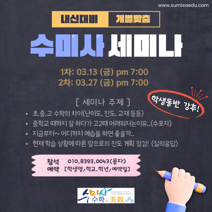 고1 상담 문의가 예상보다 빠르게 늘어나 추가반을 개설하게 되었습니다. 수업과 세미나 일정으로 별도의 홍보를 하지 못했음에도 먼저 찾아주시고 문의해 주셔서 진심으로 감사드립니다. 이룸영어는 인원을 무리하게 확장하기보다 관리의 밀도를 유지하는 방향으로 운영하고 있습니다. 추가반 역시 동일한 기준과 시스템으로 체계적으로 운영됩니다. 2026년에도 더 치열하게 준비하고, 더 세밀하게 관리하며, 아이들의 성장을 끝까지 서포트하겠습니다. 보내주신 믿음에 결과로 보답하겠습니다. 감사합니다. #해성여고 영어학원 #휘경여고 영어학원 #청량고 영어학원 #동대부고 영어학원 #대광고 영어학원 #경희고 영어학원 <img src="https://blogthumb.pstatic.net/MjAyNjAyMjhfMSAg/MDAxNzcyMjEwMDc5Mjc5.Pj-pbL6ABOjnlDsu912QMJgfuhjfmhUi2FpC9JkW7_0g.QZhHaHe2UoqbIpjyy82JiAQNqsm5QQSWM5JMlUWmaHgg.PNG/%C1%A6%B8%F1%C0%BB_%C0%D4%B7%C2%C7%D8%C1%D6%BC%BC%BF%E4..png?type=s3" />