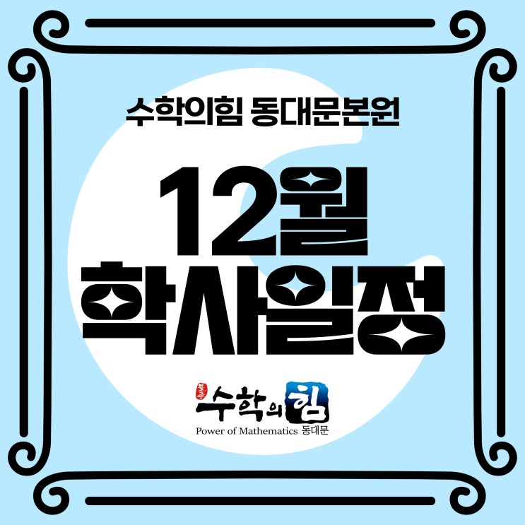 안녕하세요~! 장안동 수학의힘입니다. (수학의힘 동대문본원) 12월 겨울학기가 시작되었습니다! 한 해 동안 열심히 달려온 우리 아이들이 마무리를 잘 하고 새 학년을 차분히 준비할 수 있도록 이번 달도 정성 어린 수업으로 함께하겠습니다. 학부모님들께서도 포근한 연말 보내시길 바라며, 12월 학사일정 함께 확인해주세요^^ (초중등부) 12월 학사일정 ♥ 12월 학사일정 안내드립니다! * 12월 1일(월) 겨울학기 1차 개강 [초등부 / 예비중1] : 수학의힘 동대문에서는 12월부터 새학년으로 적용됩니다! 새 마음가짐으로 새 학기를 향한 기초 다지기, 12월부터 차근차근 준비합시다! * 12월 22일(월) 겨울학기 2차 개강 [예비중 2~3학년] : 예비....... <img src="https://blogthumb.pstatic.net/MjAyNTExMjdfMjcy/MDAxNzY0MjQxMDQ5Njkx.lPY7tm_IhkF0YPG4ZEMdaeXHn8KvySnGGu2u2j_CeG0g.LgTeim4fVKyf-g97cJj3Odjo2nxwbXWCEBXTluWYnrYg.JPEG/%BC%F6%C7%D0%C0%C7%C8%FB-%BA%ED%B7%CE%B1%D7-%BD%E6%B3%D7%C0%CF-005.jpg?type=s3" />