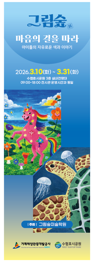 안녕하세요, 그림숲 미술학원입니다 아이들의 자유로운 색과 상상력을 담은 전시 < 그림숲展 – 마음의 결을 따라 >에 여러분을 초대합니다. 전시기간: 2026년 3월 10일(화) ~ 3월 31일(화) 관람시간: 9시~18시 (매주 월요일 휴무) 장소: 수협효시공원 3층 실내전망대 이번 전시는 아이들이 자신만의 색으로 표현한 작품들을 모아 준비한 자리입니다. 작품 하나하나에 담긴 아이들의 생각과 감정을 함께 느껴보시길 바랍니다. ※ 전시 마지막 날인 3월 31일(화) 오전에는 작품 철수 작업이 진행될 예정이므로 관람이 어려울 수 있습니다. 방문 시 참고 부탁드립니다. 아이들의 성장과 노력을 따뜻한 눈으로 응원해 주....... <img src="https://blogthumb.pstatic.net/MjAyNjAzMDNfOTUg/MDAxNzcyNTQ0MTYyNjMx.XYLLqPN9kDJKaBpysim6AyxKopyujI1joPkUltT6SGgg.t9Fyof156-2WbjWo5NY6yVS55ZrTwVDo-LfIWBOvAS8g.PNG/IMG_2782.png?type=s3" />