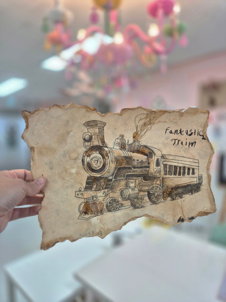 오래된 기차 안녕하세요. 오늘그림입니다 이번 수업은 커피로 배경을 만들어 올드 페이퍼 느낌을 살리고, 그 위에 펜화로 선 중심의 드로잉을 더한 작업입니다. 재료의 번짐과 선의 밀도를 활용해 색이 아닌 선으로 화면을 완성하는 경험에 집중했습니다. 커피의 농도에 따라 달라지는 색감은 자연스럽고 빈티지한 분위기를 만들고, 아이들은 그 위에 펜선을 차곡차곡 쌓아 형태와 명암을 표현했습니다. 이번 작업의 핵심은 해칭 기법입니다. 선의 방향과 간격을 조절해 입체감과 깊이를 만들어 보는 연습으로, 배운 기법을 대상에 맞게 응용·적용해 보았습니다. 기차를 주제로 한 작품에서는 선의 흐름으로 움직임과 공간감을 표현했고, 유....... <img src="https://blogthumb.pstatic.net/MjAyNjAzMDRfNzAg/MDAxNzcyNTkwMDM0NTM5.jnTWJZRwLiq26NZk7Y-UOGzwO9rjIJKMeoY3qPn-U-Qg.fQNrcwgu8qESXl4i39Tv206_p_AA-EGOGPgX1JbNuSwg.JPEG/900%A3%DF20260303%A3%DF162259.jpg?type=s3" />