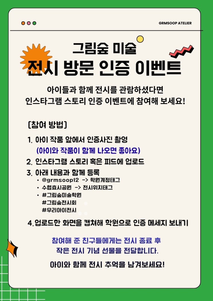 아이들과 함께 전시를 관람하셨다면 그림숲미술 전시 방문 인증 이벤트에 참여해 보세요! 인스타그램 이벤트 먼저 인스타그램 인증 이벤트 참여 방법입니다. 전시를 관람한 후 아이 작품 앞에서 인증사진을 촬영합니다. ➰아이와 작품이 함께 나오면 더욱 좋아요! 촬영한 사진을 인스타그램 스토리 또는 피드에 업로드한 뒤 아래 내용을 함께 등록해 주세요. 학원 계정 태그 @grmsoop12 전시 위치 태그 수협효시공원 해시태그 #그림숲미술학원 #그림숲전시회 #우리아이전시 업로드한 화면을 캡처해 학원으로 인증 메시지를 보내면 참여가 완료됩니다. 블로그 포스팅 이벤트 또한 블로그 후기 이벤트도 함께 진행됩니다. 전시 관람 후 아....... <img src="https://blogthumb.pstatic.net/MjAyNjAzMDlfMjU2/MDAxNzczMDY1Mjk0MTkw.QHJBX8jcJT5cVFJx68FuB6Ocb8svnWXcZfbO2jIm7b4g.bfVg9hhibyps8Q64kQL7DDEY3M32WnqqtBL3Gtm5Wvog.JPEG/IMG%A3%DF0746.JPG?type=s3" />