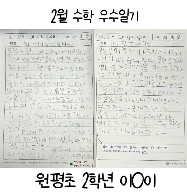안녕하세요~^^ 즐거움, 깨달음, 감동이 있는 창의 사고력 교육 와이즈만 거제 센터입니다 오늘은 2월 우수일기와 우수교재, 2026년도 첫분기의 우수일기 대상을 소개해 드립니다 수학 우수일기 과학 우수일기 3월 21일 이번주 토요일 새학기 입학설명회가 있습니다 ● 거제 와이즈만 신학기 입학설명회 ● "왜 똑같이 공부해도 결과가 다를까요?" 이번 주 토요일 오전 11시, 거제 와이즈만에서 '진짜 공부법'의 비밀을 공개합니다. 변화하는 교육 트렌드와 우리 아이를 위한 맞춤형 로드맵, 오직 현장에서만 확인 가능한 특급 전략을 놓치지 마세요! ◆ 안심 온라인 예약하기 https://forms.gle/s5dAwvNQvHiNVqPSA 좌석....... <img src="https://blogthumb.pstatic.net/MjAyNjAzMTlfMTY4/MDAxNzczOTAyMjM3Mjkw.dQv3tYpYMGYdTo572-k2OMScl7f00z2Djr5pMwct7tcg.4RKuJTlapRkMc07t6LbAn6MJhUGXQMTurMmRQpqiz3og.JPEG/%BF%F8%C6%F2%C3%CA_2_%C0%CC%C1%A6%C0%CC_%BC%F6%C7%D0%C0%CF%B1%E2_1.jpeg?type=s3" />