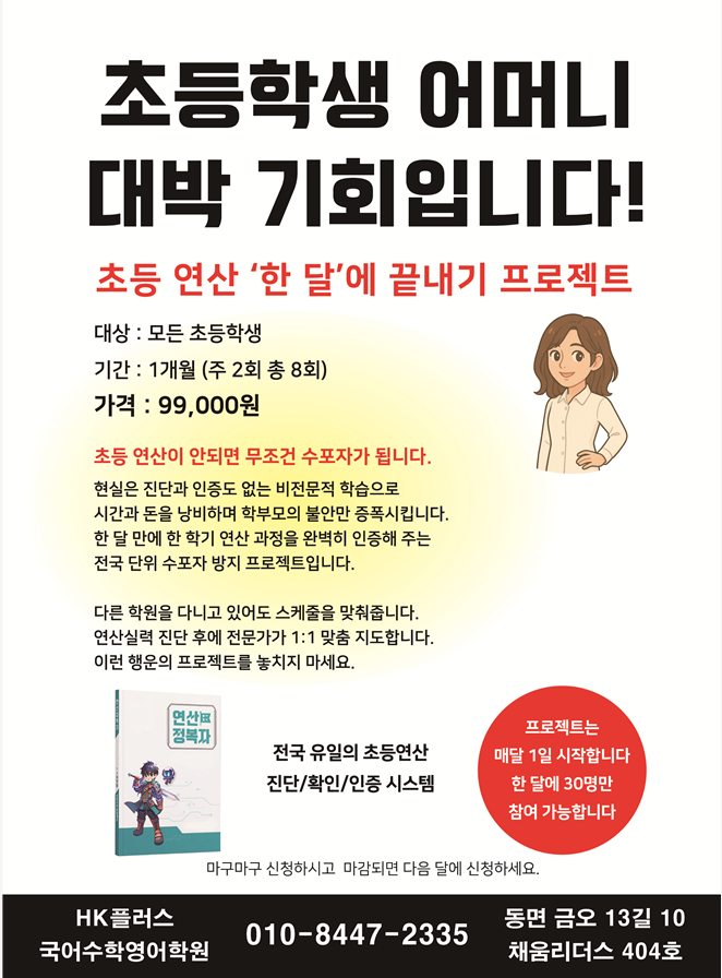 한 달로 끝나는 우리 아이 수포자 방지 특별 프로젝트!! (수포자:수학포기학생 ㅜ.ㅜ..마음 아픈 어휘이지요..) ▶▶ 바로 신청 하세요 고민하지 마시공!여기 클릭~ <img src="https://blogthumb.pstatic.net/MjAyNTExMjZfODIg/MDAxNzY0MTE4MDk0NTIz.dfAaFIPV9vzKLIO3W2A01X67vLPo_bgB54qOebnUUxAg.-L4Tzy7BEb1fbDMFsus7OevNgWlWBjlupUp6_9xjzrIg.PNG/%C8%AD%B8%E9_%C4%B8%C3%B3_2025-11-26_094636.png?type=s3" />